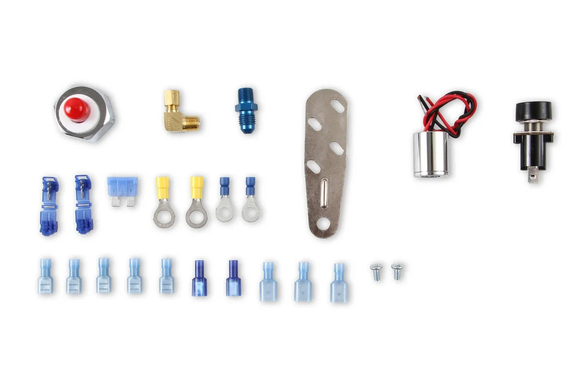 | Description_ASC | Each kit comes with all necessary components for a simple installation, including an NOS Super Powershot solenoid, push-button switch, relay, a 5-light blue LED, 12" steel tube, fittings, adapters, bottle, brackets and all necessary wiring. |