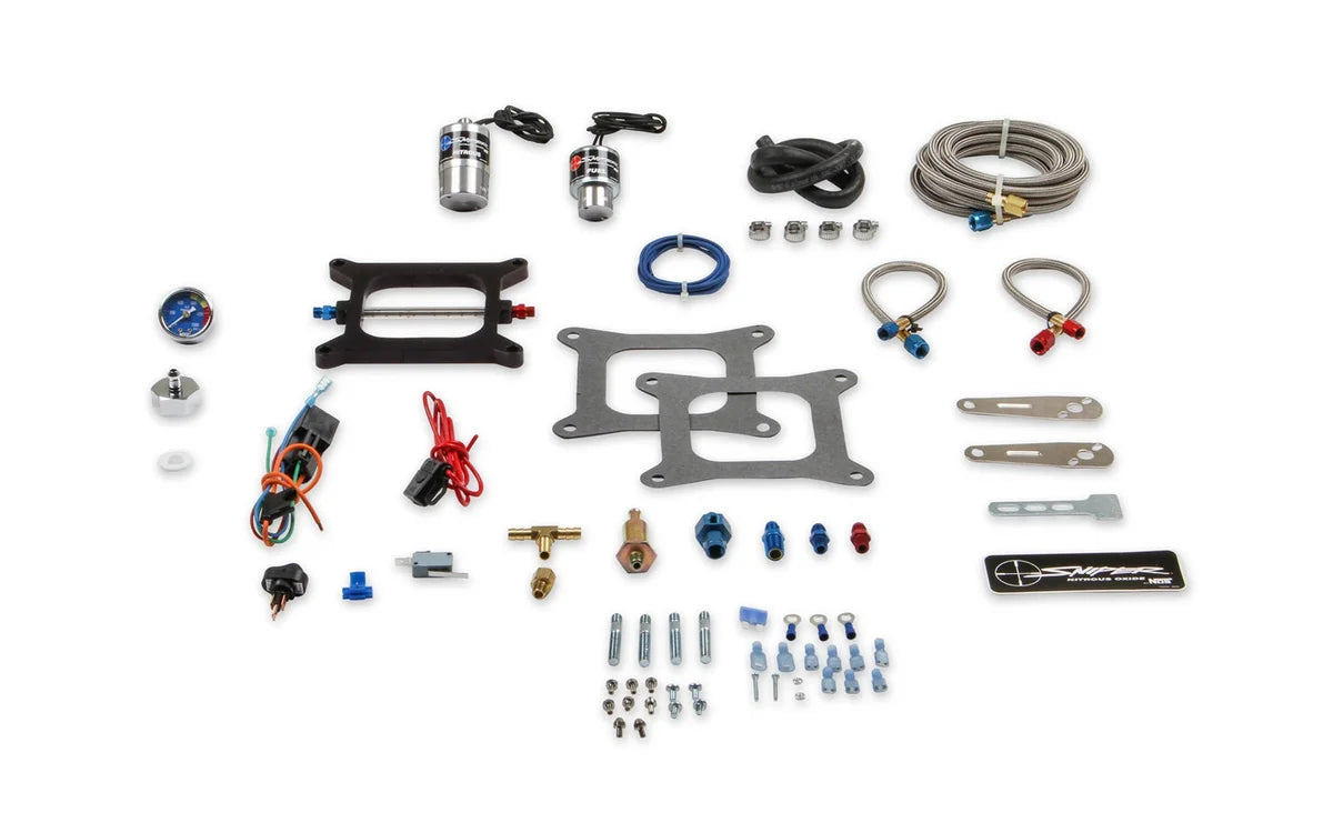 | Description_MKT | These single stage wet kits have everything needed to add some extra power to your engine. The kit includes a 10 lb. Sniper orange nitrous bottle, 14 ft. -4AN feed line, stainless bar nitrous plate and the new, large body, Sniper Solenoids. Also included is all the hardware required as well as nitrous and fuel jetting for power levels of 150, 175, 200 & 250 horsepower, additional jets are available at www.nosnitrous.com. |