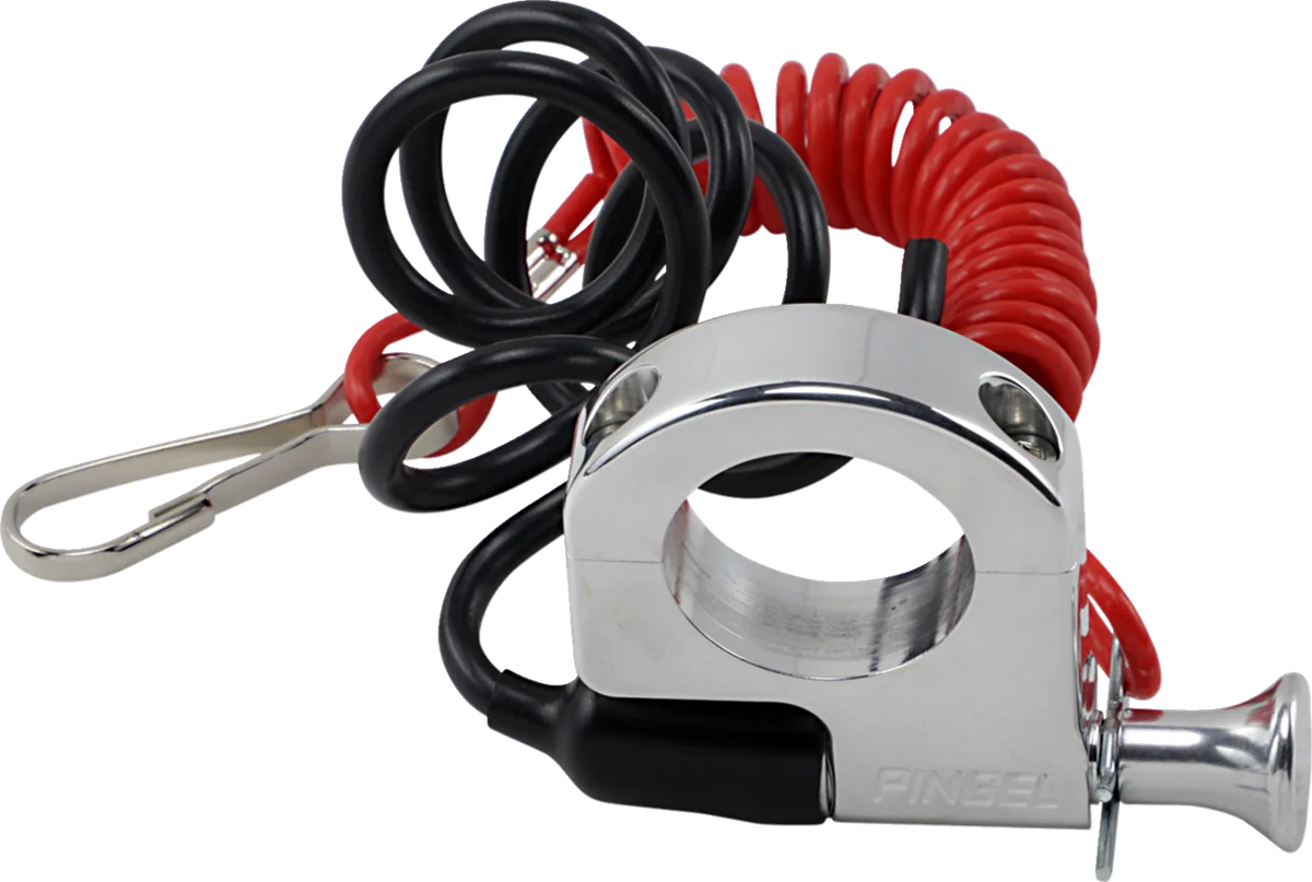 Handlebar-mount tether kill switch protects your expensive motor from over-revving. Complete with a clipped tether cord that extends to 50". Optional tether cord is easy to attach and offers a hook-and-loop adjustable wristband that will fit over gloves. Two-piece handlebar mount clamps around handlebars; available for 7/8" or 11/8" handlebars. Made from billet aluminum with water-resistant, stainless steel internal components. Made in the U.S.A..
