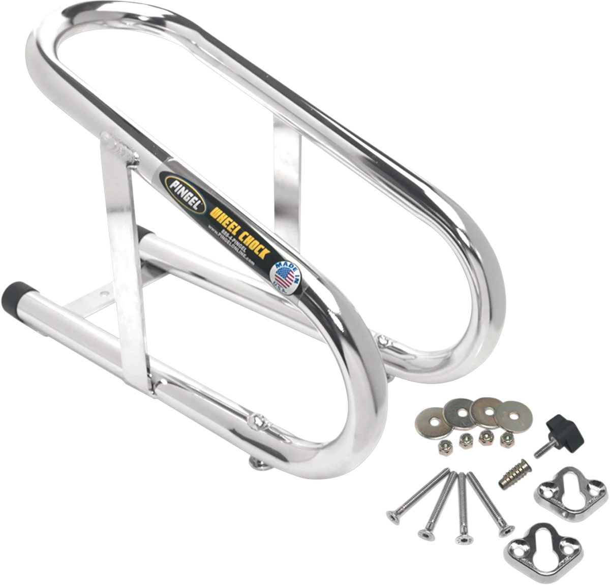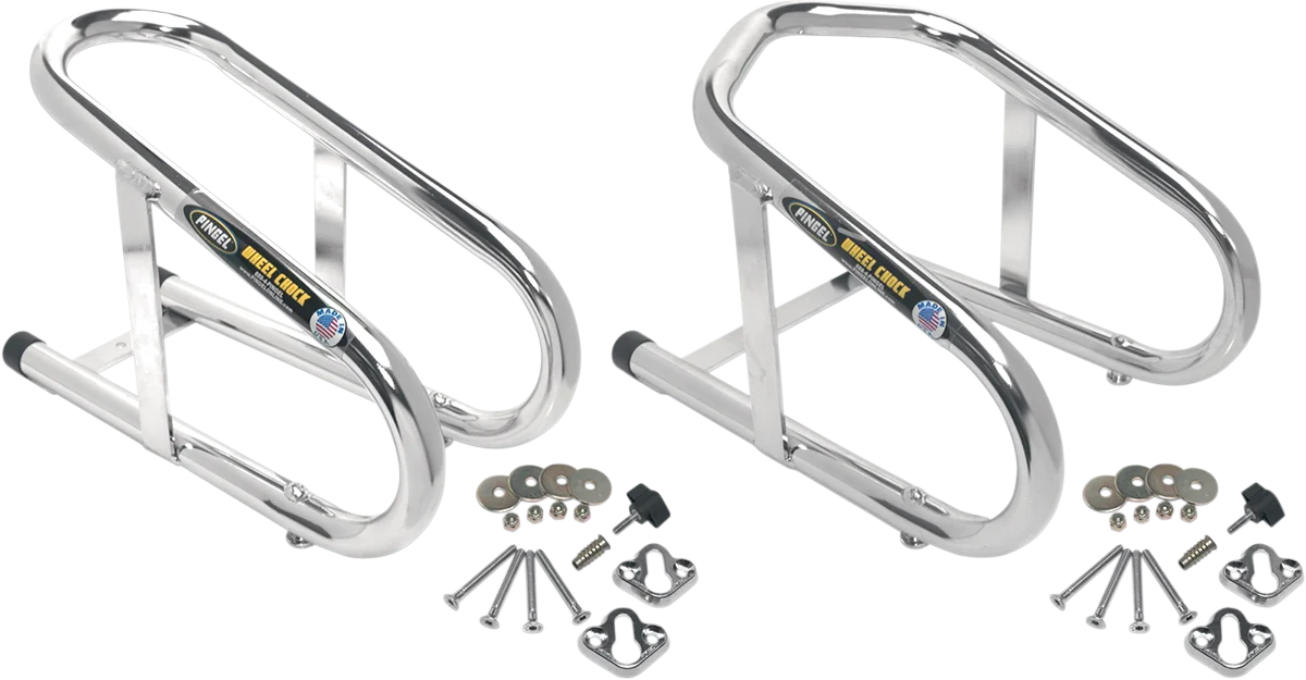 Mounting brackets remain fastened while the chocks are easily removed by unscrewing the T-bolt hold-down screw. Stabilize the front wheel of a motorcycle for trailer transportation. Wheel chocks can easily be removed when not in use. Made in the USA. Additional mounting kits sold separately, enabling you to move the chock from one surface to another without removing the mounting brackets..
