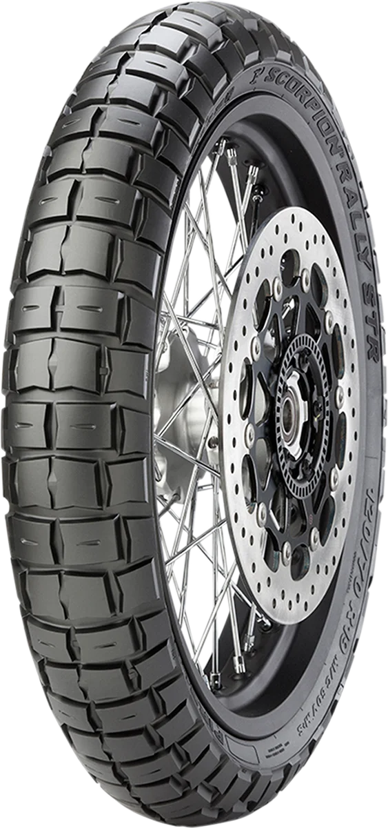 Blocks are longer and wider, and the longitudinal distance between each line of knobs has been reduced to increase the contact patch, without compromising off-road traction. Compound, with a high content of silica, offers increased grip on both dry and wet surfaces, stability and a superior resistance to abrasion. Technological innovations provide traction on dirt, stability at high speeds, on-road handling agility and grip in all riding conditions. Increased width and length of the tire's contour makes a larger contact patch for better stability. Heat, generated by high speed, is distributed across a wider surface to prevent knob tearing.