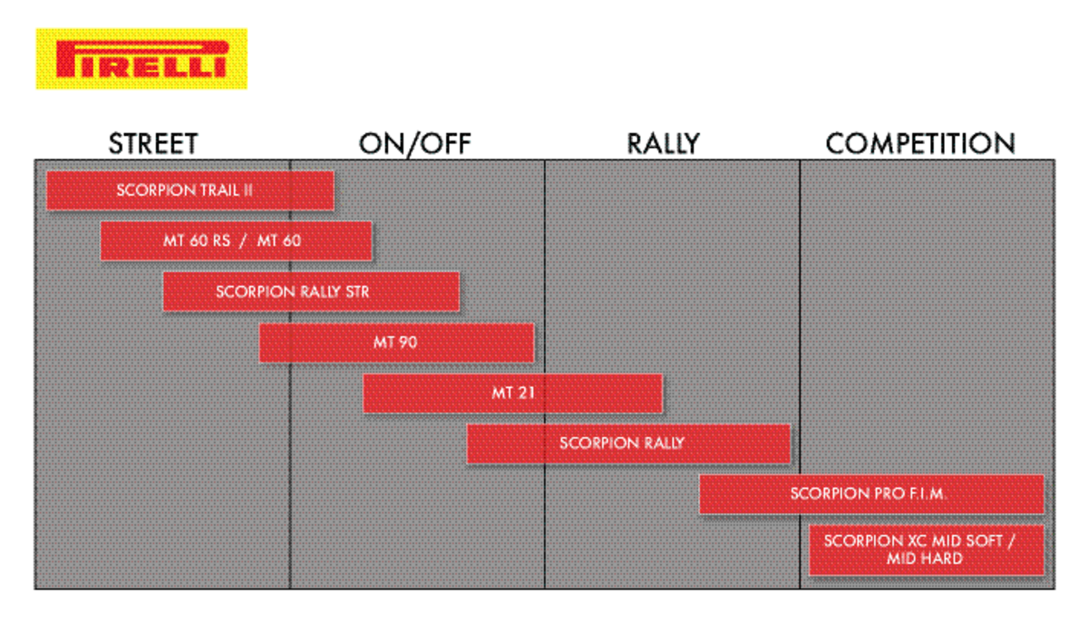 Innovative tread pattern combines the typical off-road style of the Pirelli Scorpion™ range with the experience directly derived from the Angel GT (Pirelli's top sport touring product). Incredible versatility ensures peak performance on long, straight journeys or twisty roads with the most adverse weather conditions. Increased mileage, improved wet grip with an incredible performance consistency throughout its entire life cycle. Central compound developed for higher mileage and improved behavior in wet conditions. Larger center compound stripe to guarantee enhanced cornering performance. Peak performance of enduro and sport touring blended into one product. Side compound for optimized balance between dry and wet performance. High performance for heavy, fully-loaded bikes.