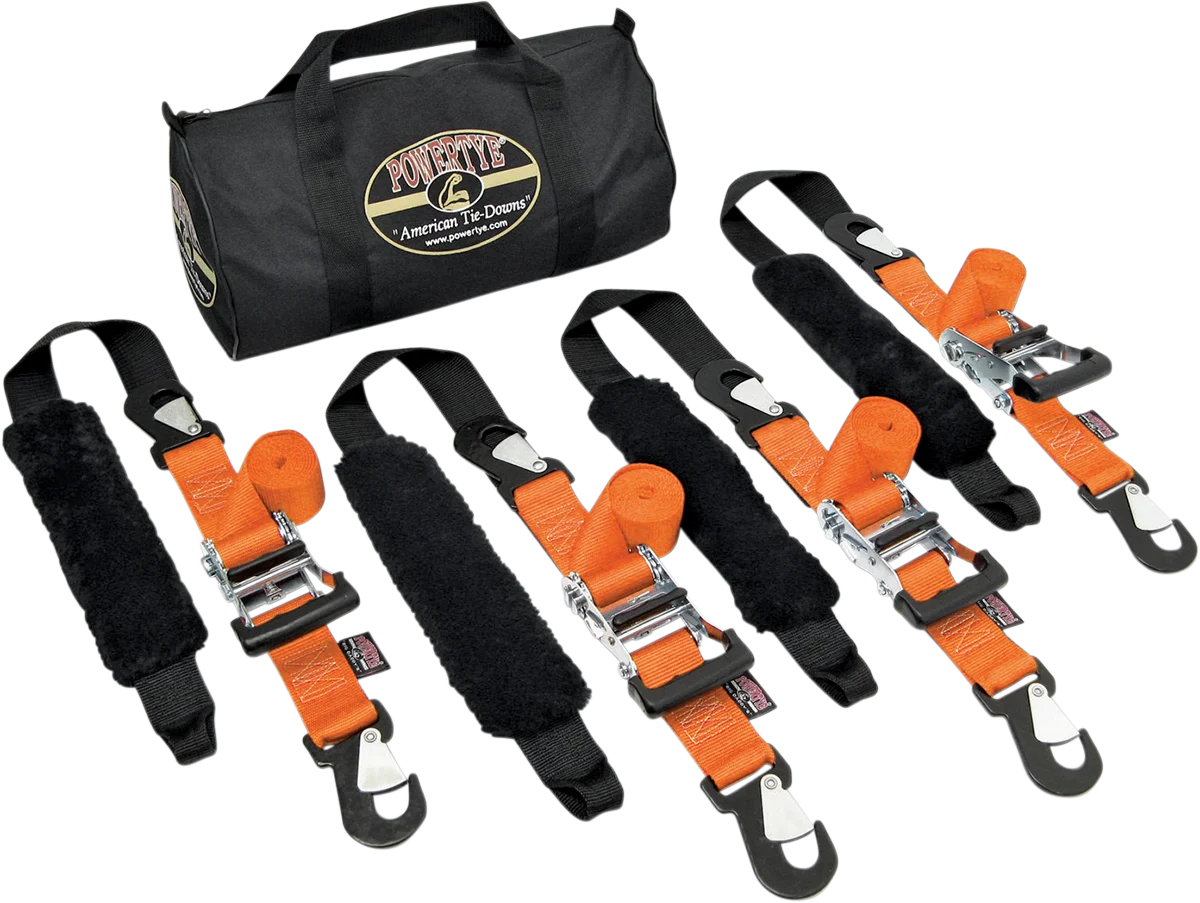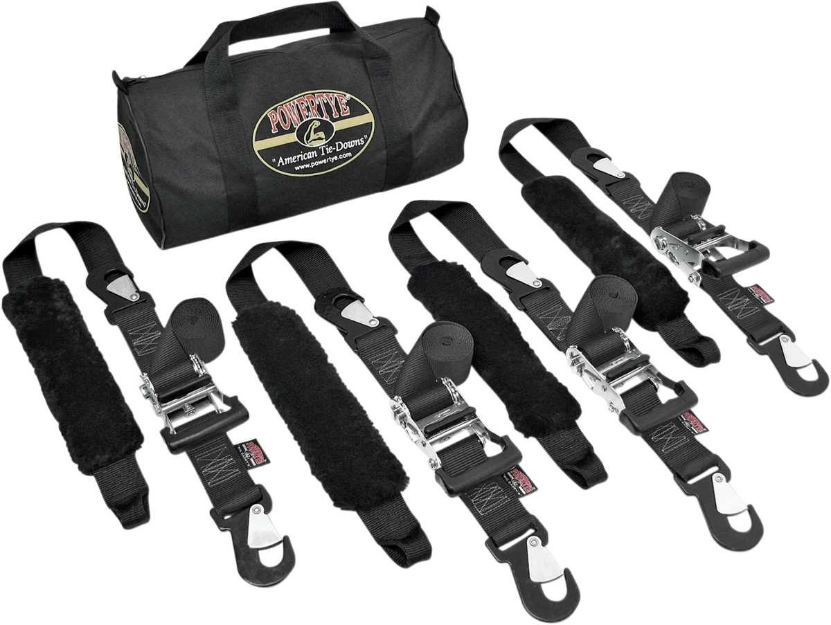2" wide heavy-duty ratchet with ergonomic rubber handle. Genuine sheepskin sleeve. Black webbing Soft-Tye sewn-in. 7,400-lb. test nylon webbing. Heavy-duty vinyl-coated secure hooks. 1,200-lb. working load. Double-security stitching. Include heavy-duty Cordura® storage bag with zipper top closure. Made in the U.S.A..
