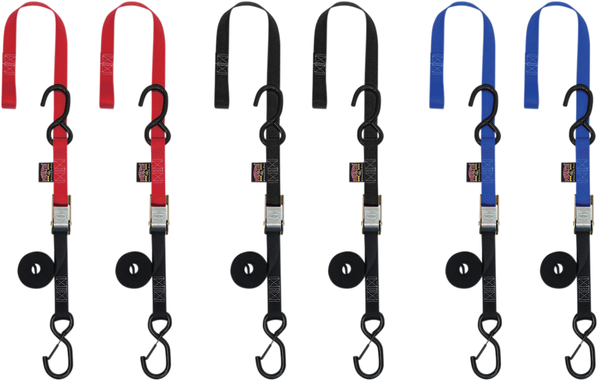 Secure latch hook with vinyl-coated S-hook. 1" wide cam buckle. Integrated hand loop for easy adjustment. 4,500-lb. test nylon webbing. 400-lb. working load. Double security stitching. Made in the U.S.A..