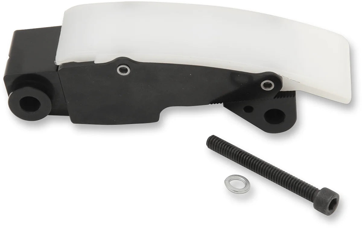 Manual primary chain adjuster. Stops over-tightening of the primary chain that can occur with the stock automatic adjuster. Reduces the stress on the motor sprocket bearings and transmission drive bearings. Allows correct adjustment of the primary chain to the factory specifications of 5/8" to 7/8". Requires removal of the primary cover for installation or adjustment. Uses the OEM mounting hardware. Instructions included.