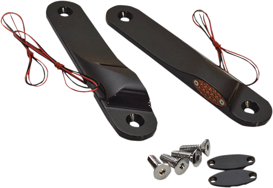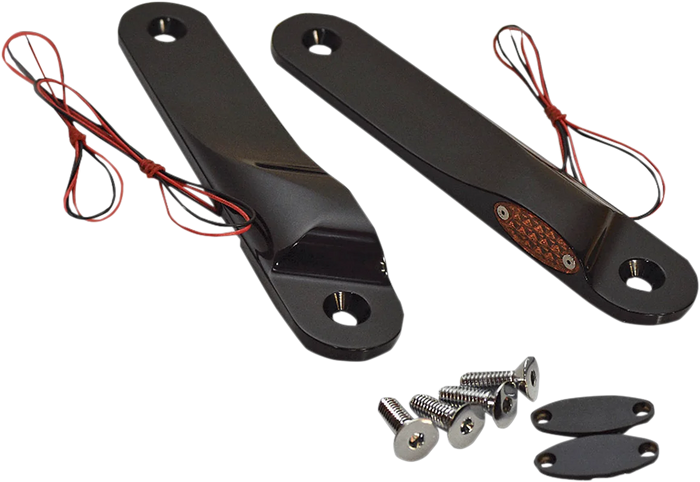 Custom way to replace stock turn signals. Bolt directly to stock mounting holes with no drilling. Super-bright, single-function amber LEDs and amber lenses. Include an extra set of smoke lenses for a "clean" look. Machined from 6061-T6 aluminum.