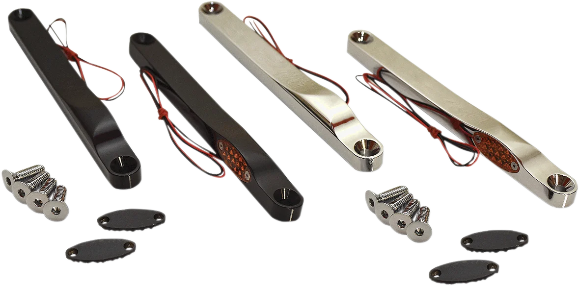 Custom way to replace stock turn signals. Bolt directly to stock mounting holes with no drilling. Super-bright, single-function amber LEDs and amber lenses. Include an extra set of smoke lenses for a "clean" look. Machined from 6061-T6 aluminum.