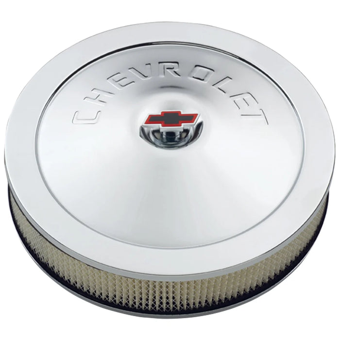 Description_MKT | This engine carburetor air cleaner kit is a 14 inch diameter and features a stamped "Chevrolet" lettering on the top cover. This "Classic" style air cleaner also includes a "Bowtie" logo style center air cleaner nut. They are manufactured from high quality steel material and feature a great looking chrome finish. Overall installed height when on the carburetor is 3.375 inches. A 3" tall high flow paper air filter is also included. This is an officially licensed GM Performance Parts product. Sold as one complete kit. Backed by a limited 30 day factory warranty. |
