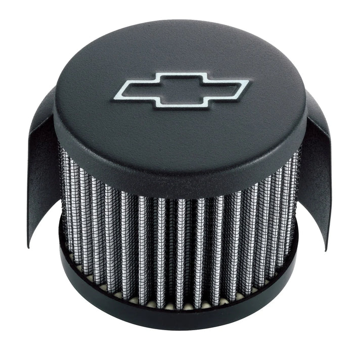 Description_MKT | These popular push-in filter air breathers, with the raised Bowtie Emblem stamped prominently in the top, are offered in two styles: with the heat-shield hood and without. 3in diameter. Fits 1.22in holes |