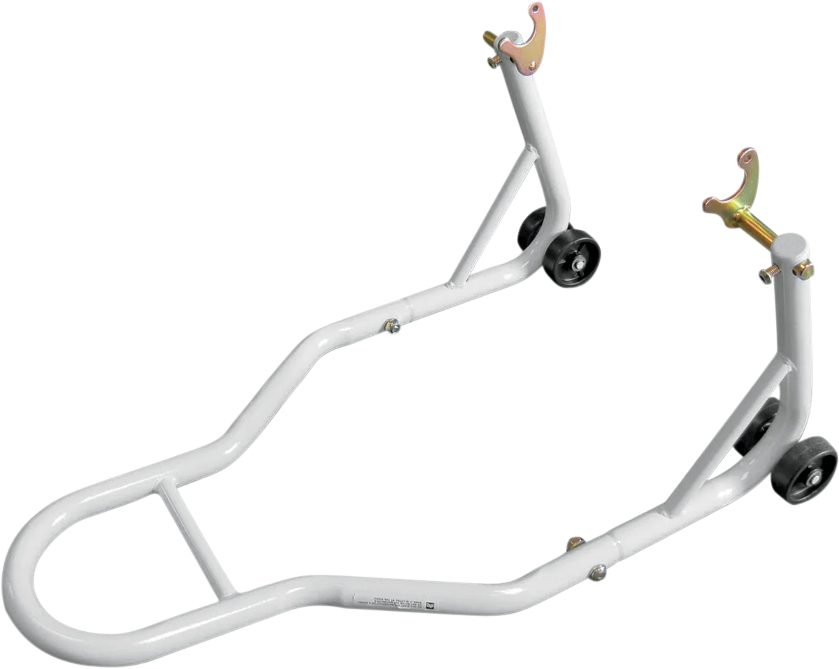 Rear stand is a universal fit for regular swingarms with spools. Width is adjustable from 13.75" to 15". Made from mild-steel material. Optional non-spool hardware available (sold separately); use on any bike without spools (sold in pairs)..