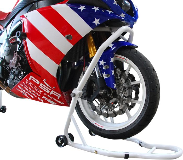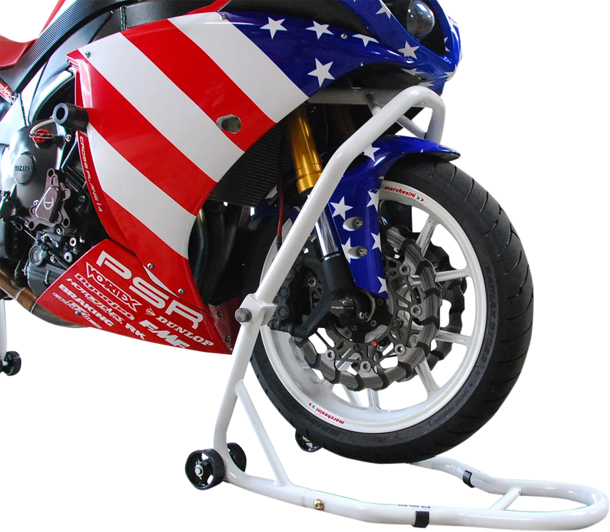 A must have for removing and servicing forks, removing front wheel and replacing brake pads and rotors. Front stand lifts from under the lower triple clamp. Bike model specific pins are sold separately.