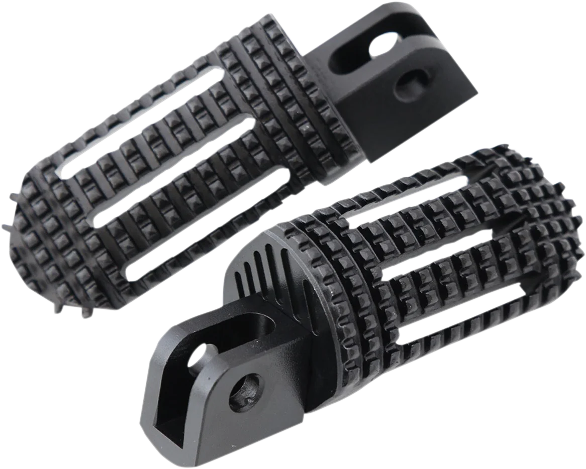 CNC-machined forged aluminum construction. Flip-up or flip-down design to fit your riding preference. Flip Up (+16 mm) for a higher contoured surface that provides better sportriding and improved ground clearance. Flip Down (-16 mm) for a lower flat, wide profile and increased comfort. Three forward tilt settings to suit rider's preference. Grippy spikes for excellent traction and feedback. Fits OEM footpeg bracket.