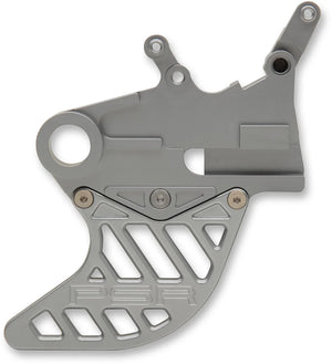Heavy-duty protection for vulnerable rear brake rotor. Machined from forged aluminum. Most come with built-in caliper mount. Fin can be replaced separately if damaged.