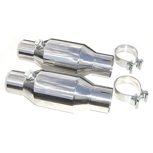 Catalytic Converter - High Flow Mini-Cat Kit - 2.5 in Inlet - 2.5 in Outlet - Round - 11 in Long - Clamps Included - Stainless - Polished - Pair