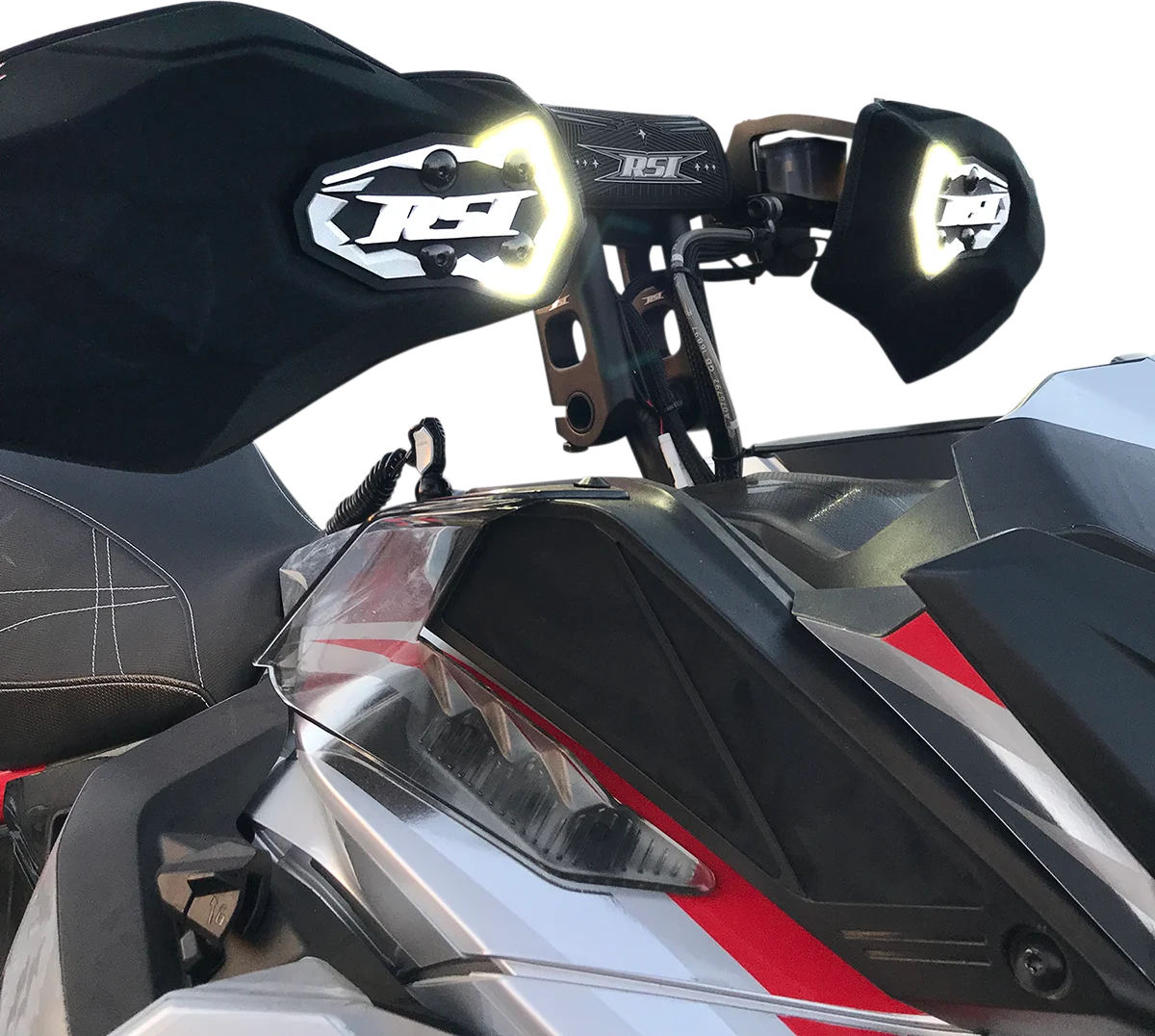 Ultra bright LED’s provide styling as well as additional light. Available with simple Plug and Play wiring harness for most modern machines. Extremely unique, flexible, weather resistant, and yet very durable material. The handguards expanded coverage not only provides extreme weather protection, but its sweep backwards design keeps the area warm during all conditions. The unique two position mounting base allows the handguard to be moved closer or farther away from the grip with ease. Will not crush, deform, or warp under any condition, including rollovers. Works will all types of riding: Mountain, Trail, and Backcountry. Requires RSI handguard mounting.