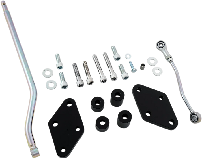 Kit relocates the stock OEM forward controls 2" rearward. Provides additional leg space by moving the pegs outward. Kit includes mount plates, spacers, shift linkage rod, brake linkage rod, and mounting hardware.