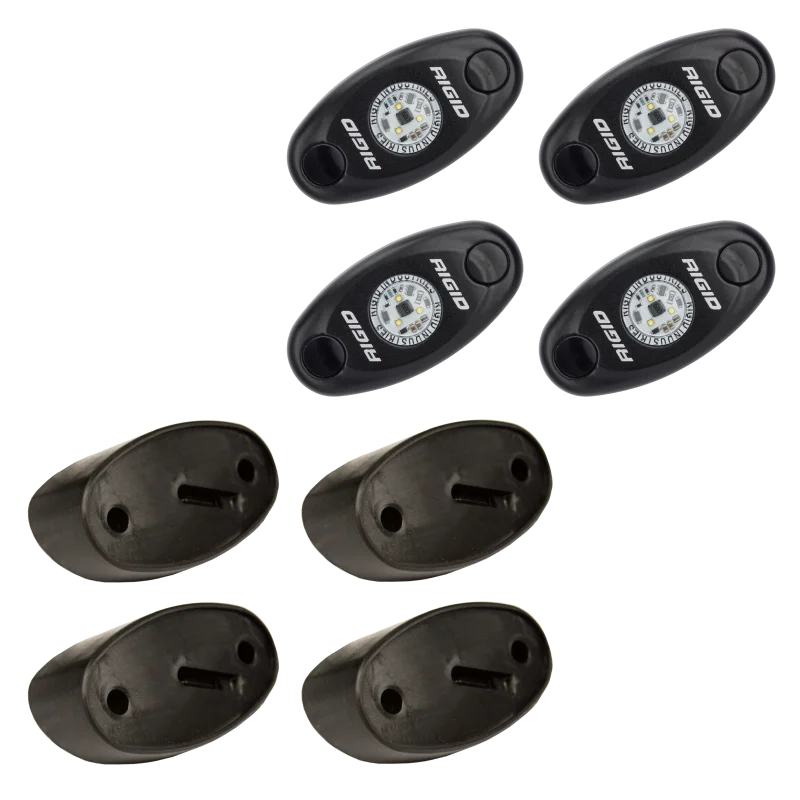 The RIGID Rock Light Kit uses the power and durability of A-Series LED lighting and adds custom 15 foot leads on each light, switch and angled mounts to light up the undercarriage of any truck, Jeep, or all-terrain vehicle. This kit will allow you to light up the trail with strategically placed lights on the vehicle. Perfect for night rock crawling, the LED lights are available in a variety of colors, including white, red, blue, or amber to aid night vision or accent vehicle colors. RIGID Rock Light Kits are available in 4-light or 6-light configurations to enhance and customize your night crawling experience. Own The Night with the original LED Rock Light Kit.
