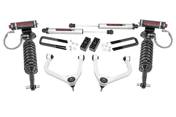 | features | Lifts and levels front of vehicle with rear Includes pre-loaded coil for no-fuss installation Front Lift: 3.5in Rear Lift: 2.5in Increased ground clearance. Includes forged aluminum control arms Control arms include POM ball joints for greater range of motion and easier installation Ball joints are pre-installed to ease installation. Fabricated lift blocks are stronger and offer a longer lifespan than cast blocks. |