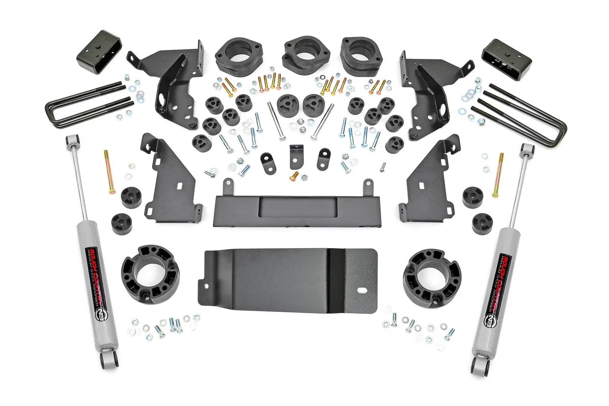 | features | Increased ground clearance. Differential drops maintain proper axle angle. Fabricated lift blocks are stronger and offer a longer lifespan than cast blocks. Features application valved N3 series shock absorbers which offer the best in balanced performance for on and off-road use. Increased ground clearance Body lift provides 1.25-inch of lift opposed to the standard 1-inch" Includes front bumper brackets Rear bumper is relocated using factory brackets Fits both standard cab and 4-door models Body lift pucks are made from fiberglass reinforced nylon for superior strength and durability Body lift pucks are full size, maximizing surface contact Maintains the noise and vibration canceling characteristics of the factory mounts |