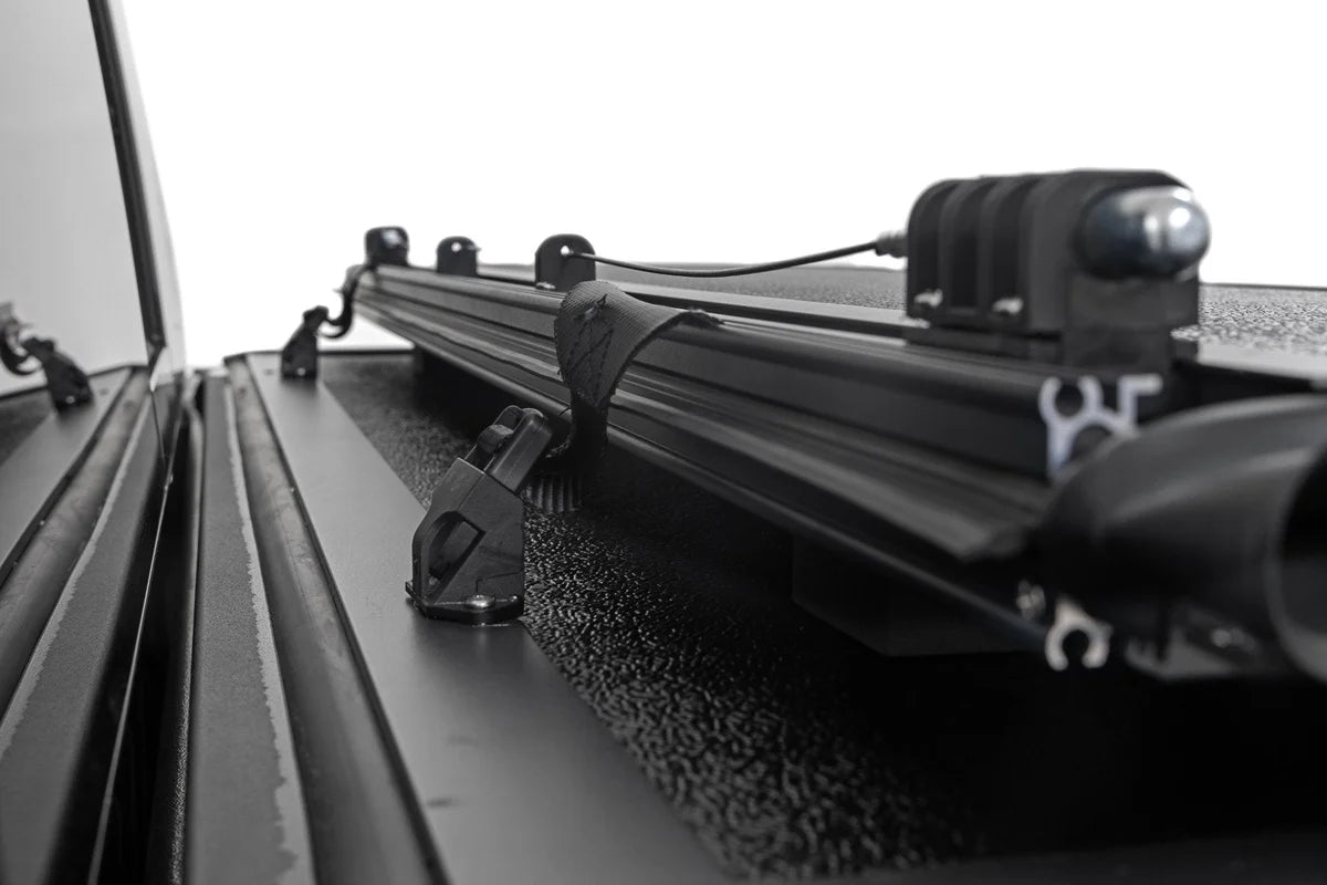 | features | Flush, low-profile design with stylish matte black finish frame and aluminum panels. Tri-Fold Design allows quick access to cargo. Corrosion resistant black powder coated aluminum frame. Secure track and rail mounting system with drain tubes included. Nylon straps secure the cover in the 2/3 open position. Drive with the cover in the 2/3 open or closed position. Auto latching design secures on closure. Single cable pull for easy latch release and access. No drill easy install and removal - all tools included. Nylon safety straps included. 5 Year Warranty. |
