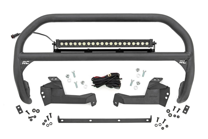 | features | Easy bolt-on install 3-inch diameter steel tubing Corrosion resistant black powder coat Added protection for the front end of your vehicle Features stamped "RC" logo Bull bar features 5-year limited warranty Light bar features 3-year limited warranty |