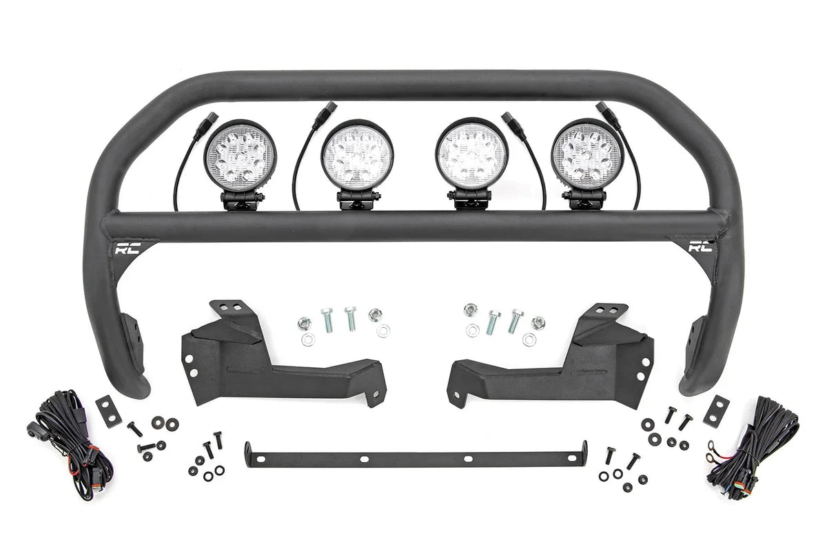 | features | Easy bolt-on install 3-inch diameter steel tubing Corrosion resistant black powder coat Added protection for the front end of your vehicle Features stamped "RC" logo Bull bar features 5-year limited warranty Light bar features 3-year limited warranty |