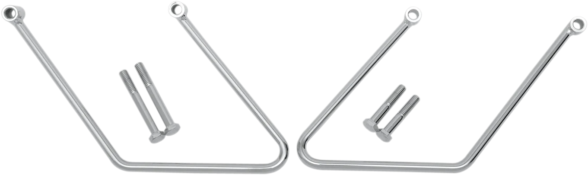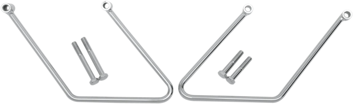 Chrome-plated steel brackets hold throw-over saddlebags away from brake caliper and swingarm. Fasten to shock absorber upper studs or fender struts. All necessary mounting hardware included; sold in pairs. Not compatible with OEM detachable sissy bar/luggage rack..