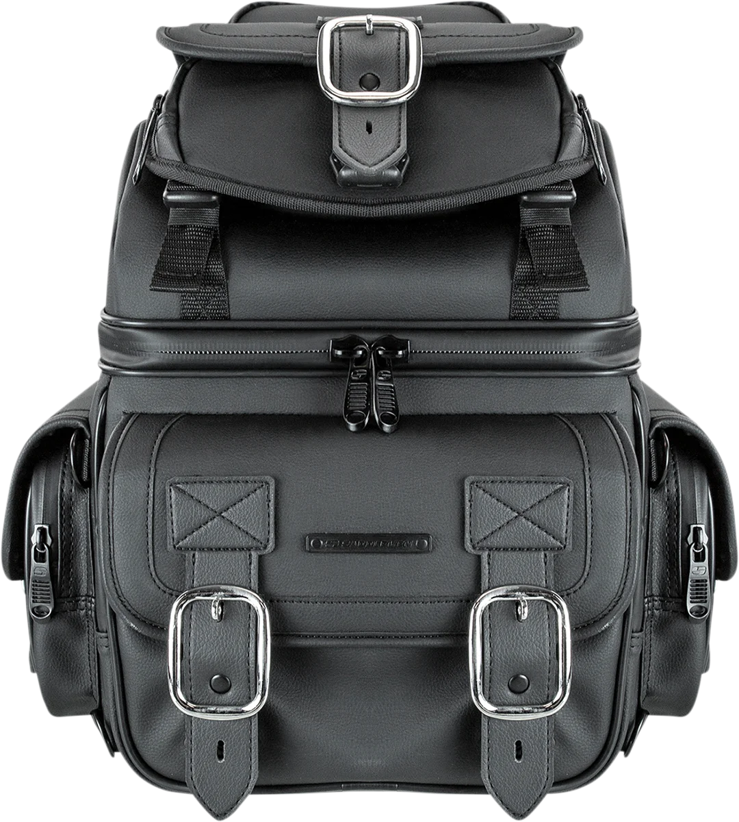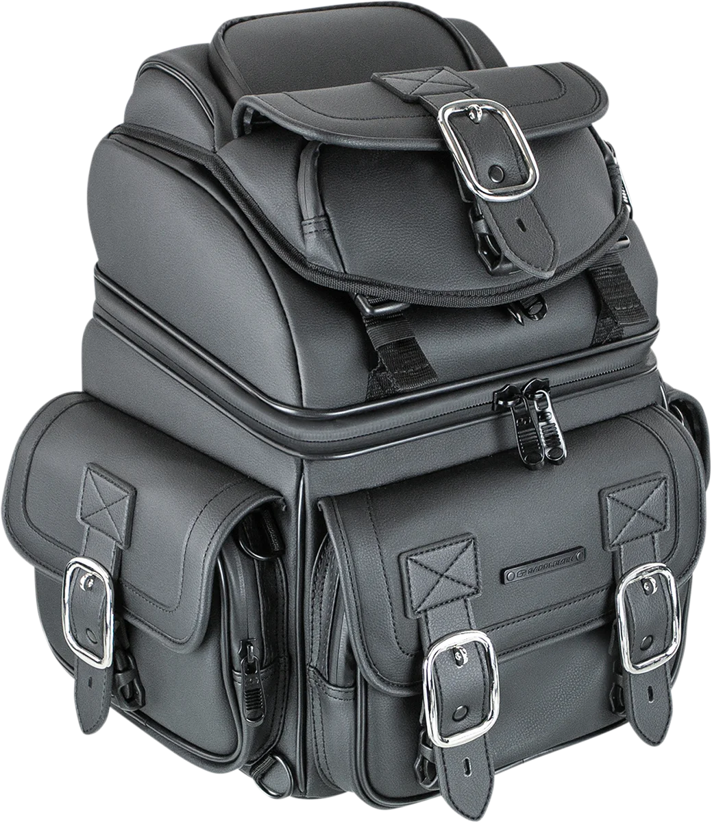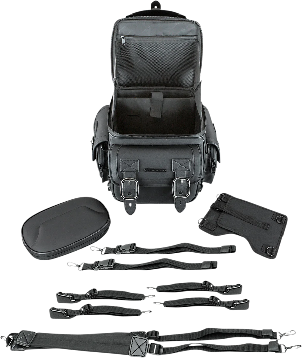 Black vinyl construction matches all Saddlemen seat material. Maintains shape even when bag is empty. Three large external pockets. Waterproof zippers. Internal zippered mesh pockets keep items organized. Easily attaches to sissy bar, plus mounting strap kit for a variety of mounting options. Strap ends include a unique keepers system which eliminates the need for cutting. Multiple heavy-duty D-rings for additional attachment options.