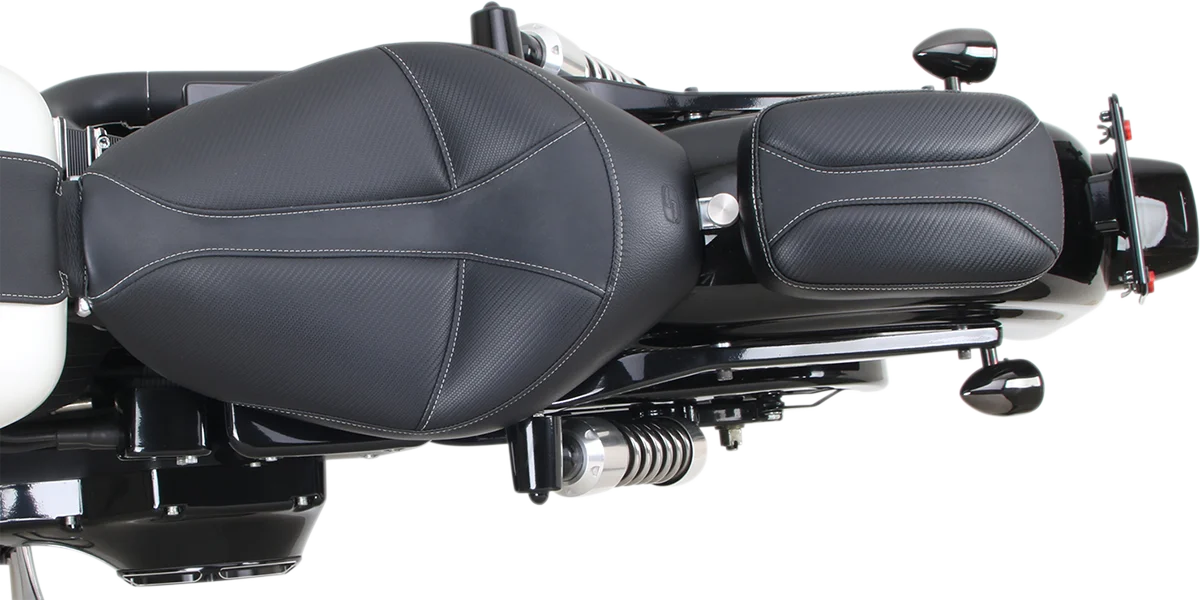 One of the lowest profile and best looking pillions on the market. Each pad attaches easily and securely, unique dry-installation, dual-cavity suction cup and can be removed just as easily using the built-in quick release pull tab. The pads' non-abrasive liner also ensures your expensive rear fender paint job is protected during attachment or removal. Made in the U.S.A.. Not for passenger use; for cosmetic use only.. Pads should be installed dry; do not wet either fender or suction cups during installation.. Not for use in hot, wet or rough conditions..