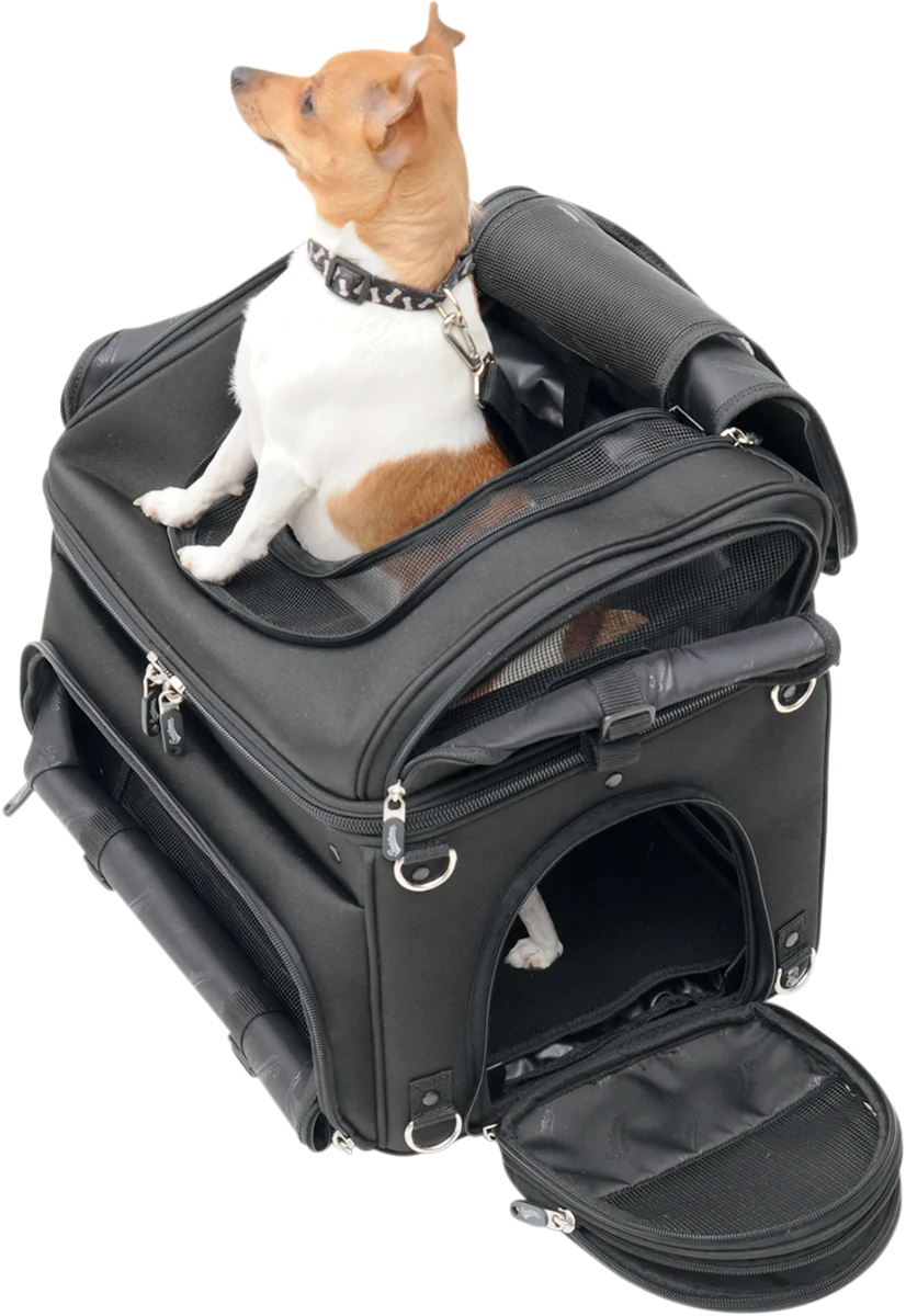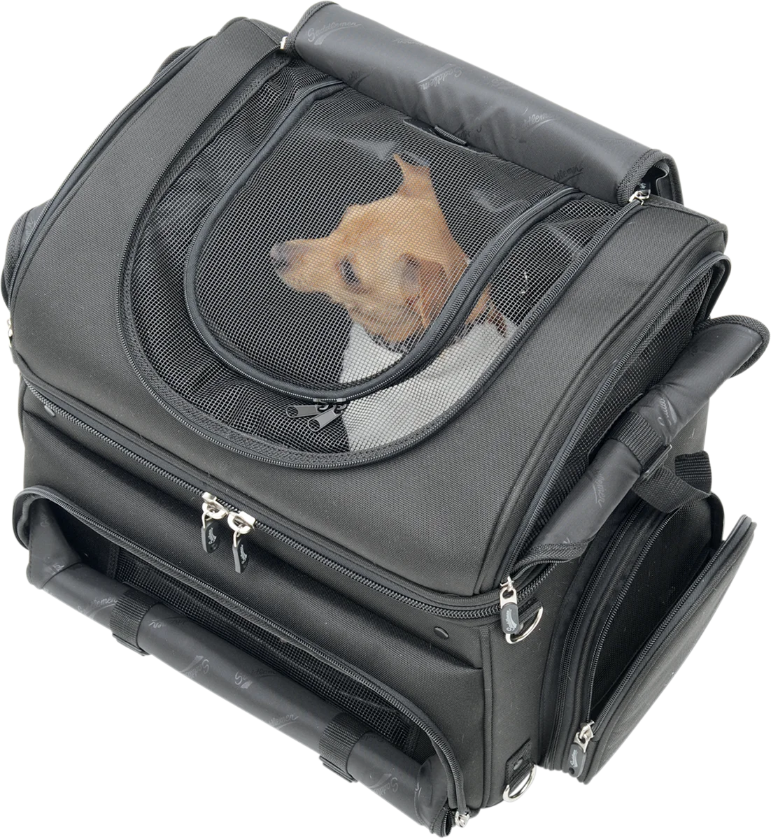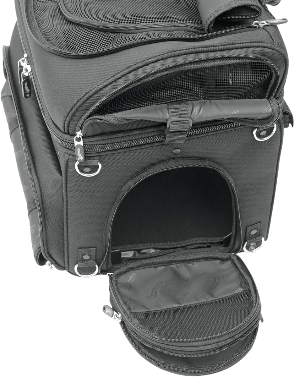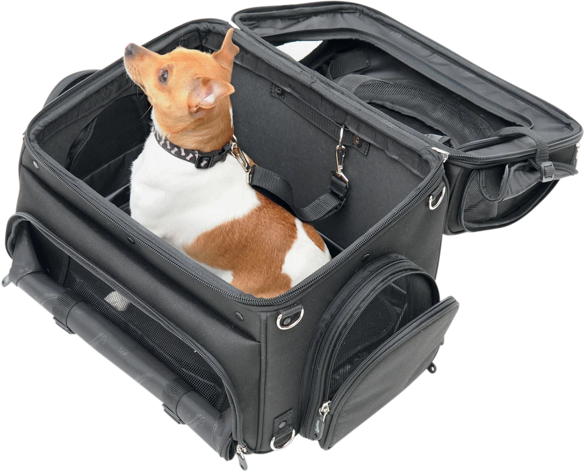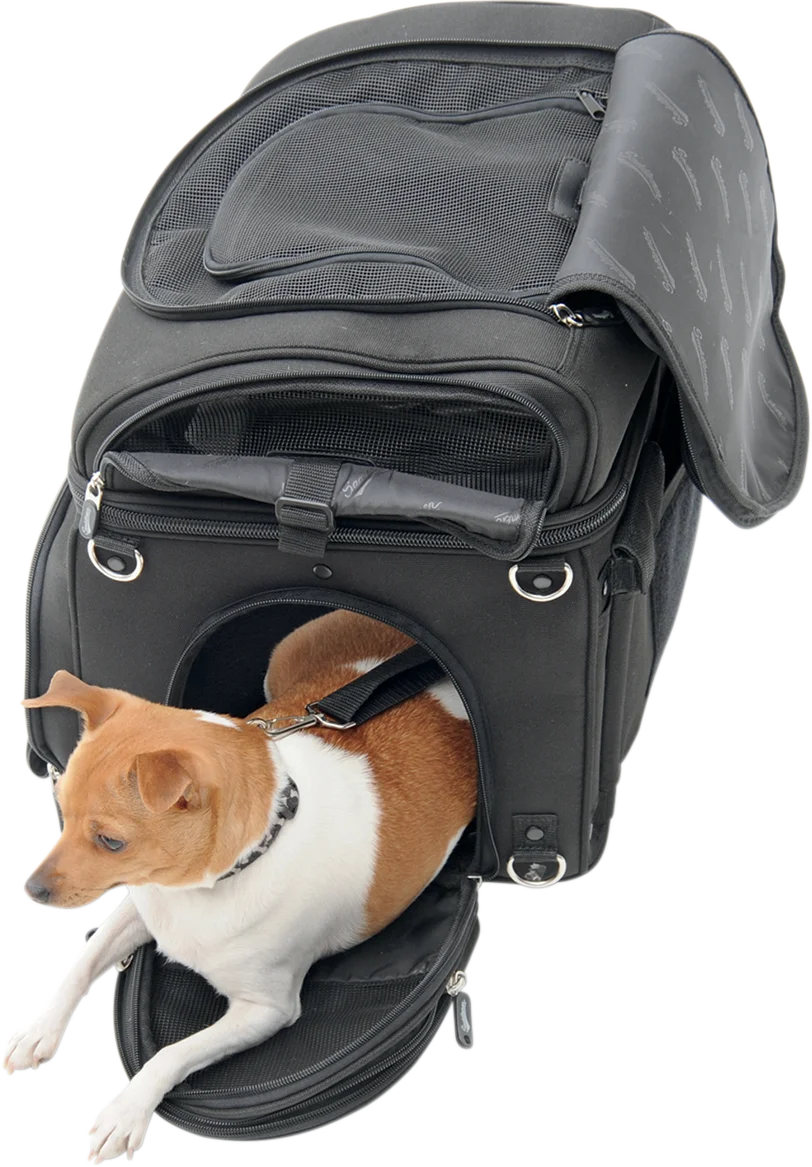 The best way to carry your small pet on your motorcycle in comfort, plus this carrier doubles as an effective cargo bag. Multiple vents and access flaps let you vent fresh air to your pet while providing easy access to your pet or cargo. Spacious pet compartment includes a removable and washable bottom tray and resting pad for your pet's comfort; includes food and water trays that stow neatly in their own compartment. Two mounting systems included; a Saddlemen Versa-Mount seat harness or adjustable sissy bar strap system easily attaches the bag to your motorcycle’s seat, luggage rack or sissy bar. Quick-disconnect mounting straps and sissy bar sleeve allow the bag to be removed from your motorcycle in seconds. Includes a plush back rest pad you can position for your, or your passenger's, riding comfort. Convenient liner bag with carry handles lets you store clothes or cargo away from your pet or other bag contents. Sturdy grip handle for convenient carrying - included backpack straps allow you to carry the bag on your back with ease. Sliding leash mount allows pets freedom of movement while keeping them secured in the bag; comes with a short internal leash and a long walking leash for pet pit stops. Pet compartment measures 16" W x 14" L x 14" T (3,200 cu. in. capacity). Please note dimensions of this bag to ensure proper fit for your pet.. Returns are not available for this product..