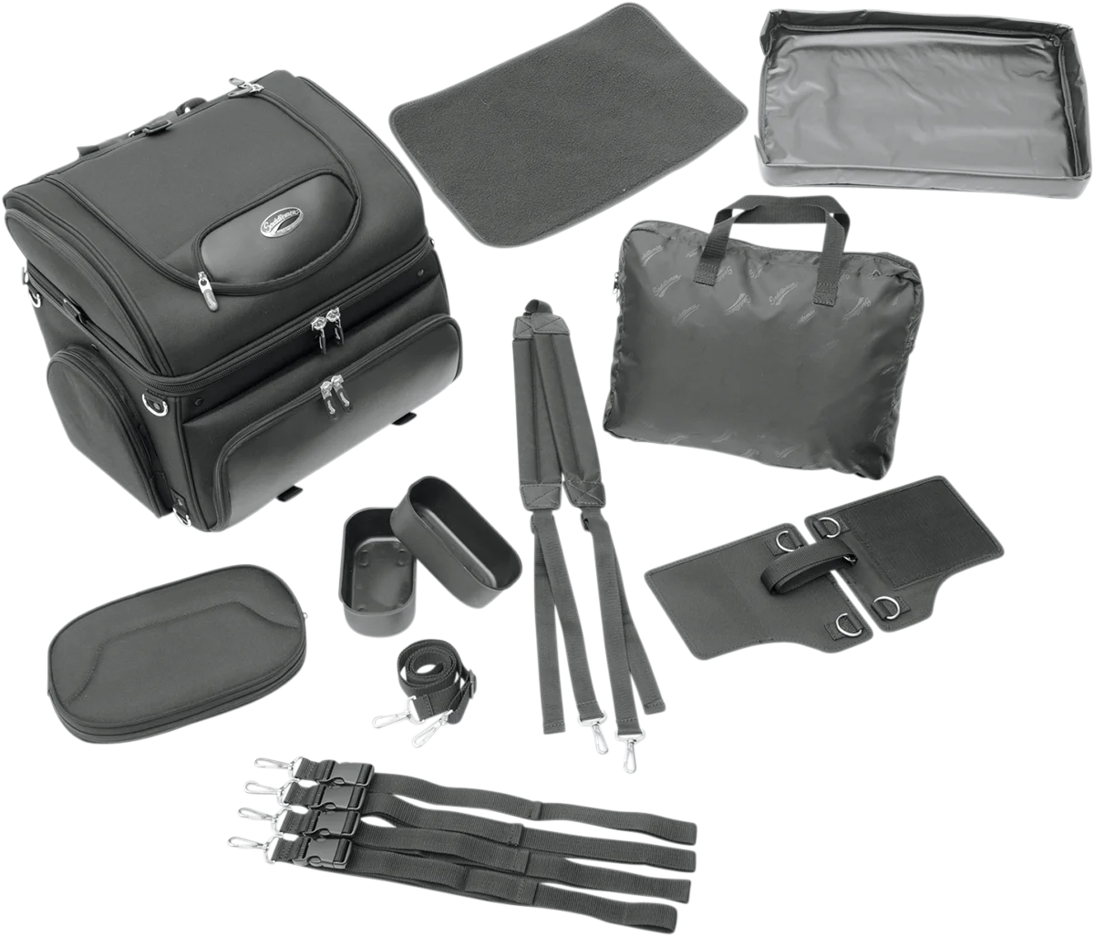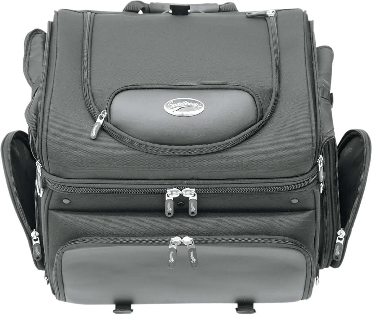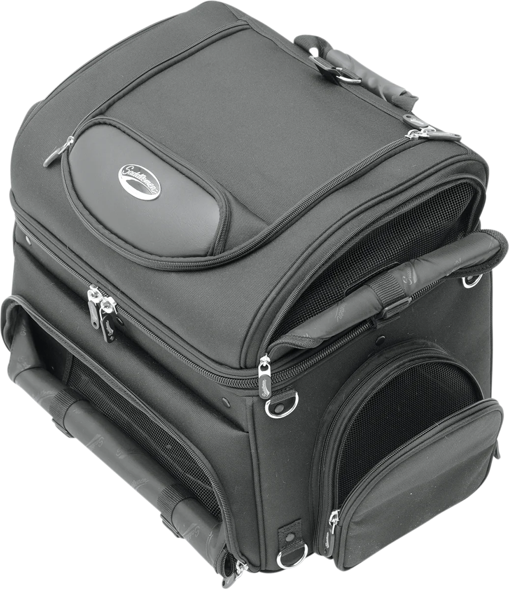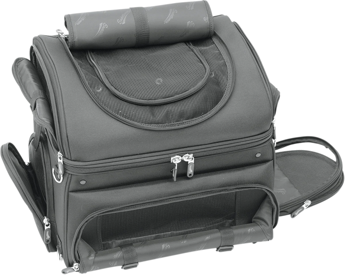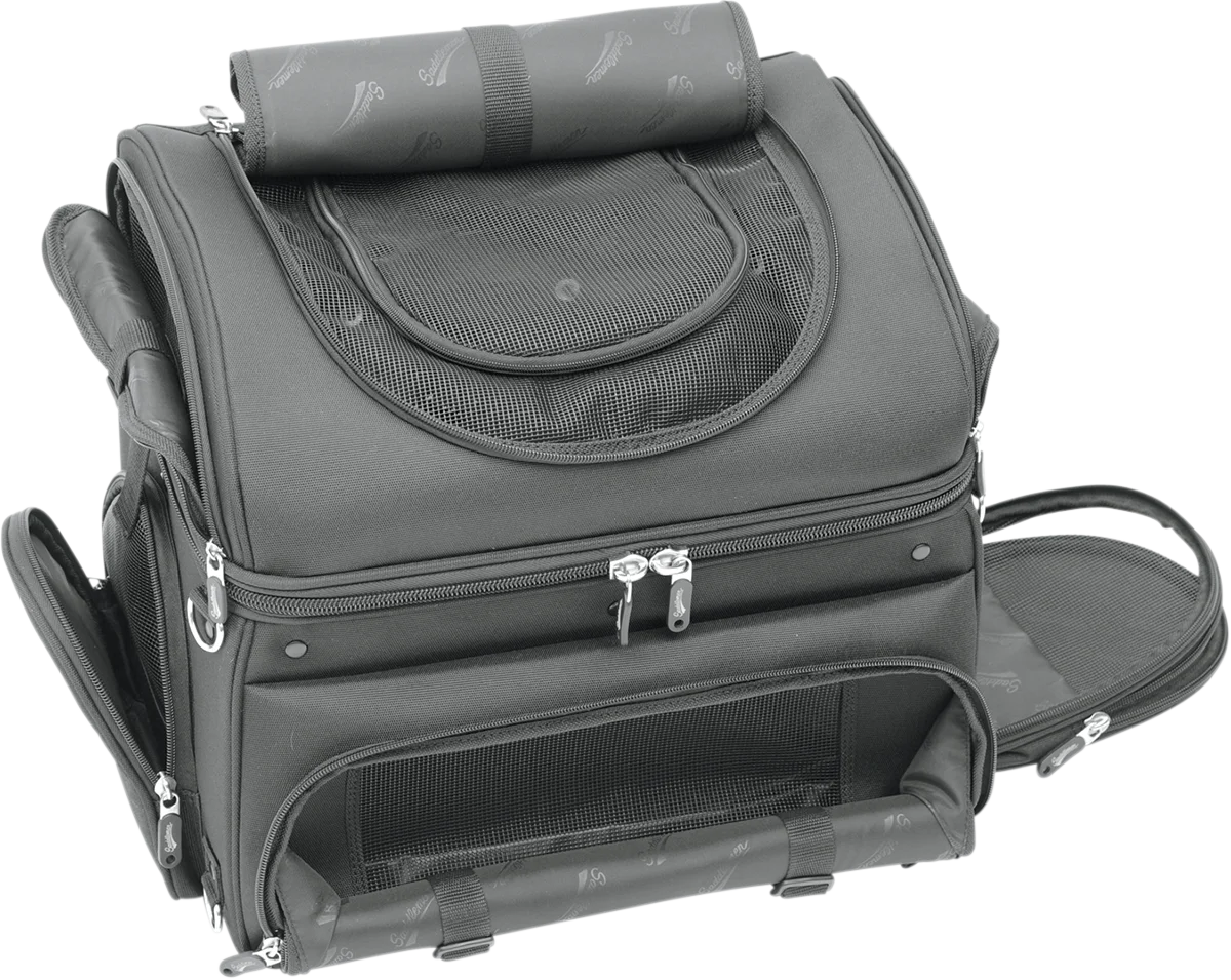 The best way to carry your small pet on your motorcycle in comfort, plus this carrier doubles as an effective cargo bag. Multiple vents and access flaps let you vent fresh air to your pet while providing easy access to your pet or cargo. Spacious pet compartment includes a removable and washable bottom tray and resting pad for your pet's comfort; includes food and water trays that stow neatly in their own compartment. Two mounting systems included; a Saddlemen Versa-Mount seat harness or adjustable sissy bar strap system easily attaches the bag to your motorcycle’s seat, luggage rack or sissy bar. Quick-disconnect mounting straps and sissy bar sleeve allow the bag to be removed from your motorcycle in seconds. Includes a plush back rest pad you can position for your, or your passenger's, riding comfort. Convenient liner bag with carry handles lets you store clothes or cargo away from your pet or other bag contents. Sturdy grip handle for convenient carrying - included backpack straps allow you to carry the bag on your back with ease. Sliding leash mount allows pets freedom of movement while keeping them secured in the bag; comes with a short internal leash and a long walking leash for pet pit stops. Pet compartment measures 16" W x 14" L x 14" T (3,200 cu. in. capacity). Please note dimensions of this bag to ensure proper fit for your pet.. Returns are not available for this product..