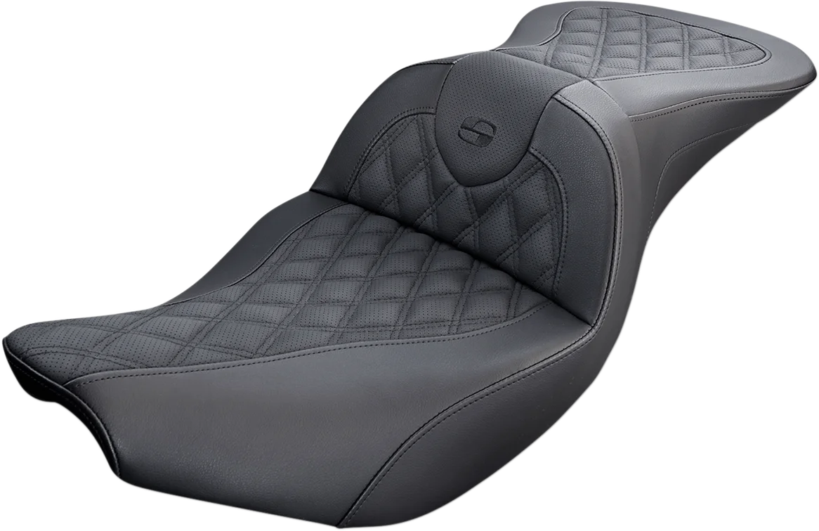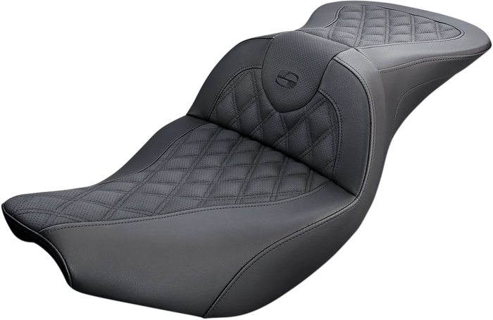 Tall lumbar support and wide driver saddle supports the back and legs for superior comfort, while the streamlined nose improves the rider's reach to the ground. Refined split-cushion design maximizes long-range comfort by separating the seating surface from the lumbar support to reduce tailbone and back pressure. SaddleGel™ in front and rear reduces tailbone pressure and increases circulation and comfort for both driver and passenger. Made with perforated leather inserts and weatherproof, no-maintenance-required SaddleHyde™. Comes with a fitted rain cover specially designed to protect your seat from water and dirt. Ventilated soft leather upholstery provides a luxurious look and ride. Designed and made in the USA.