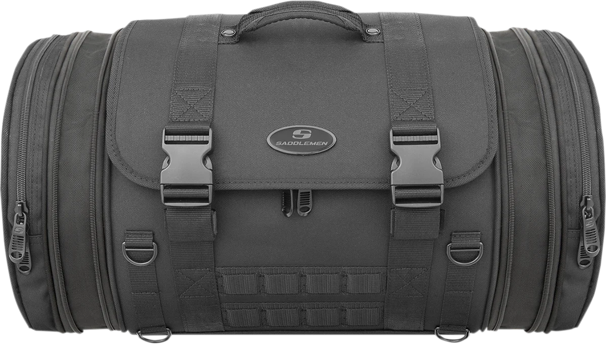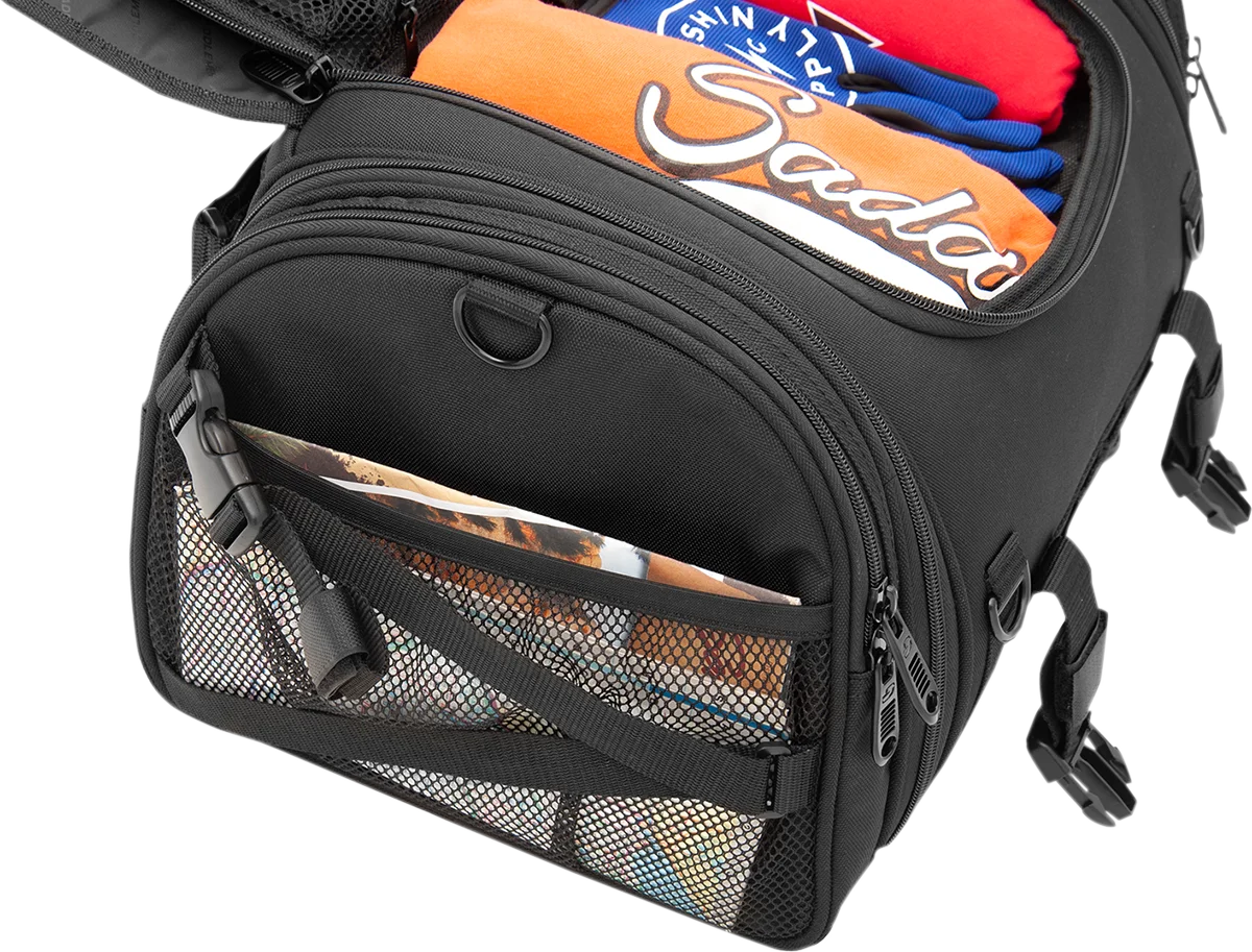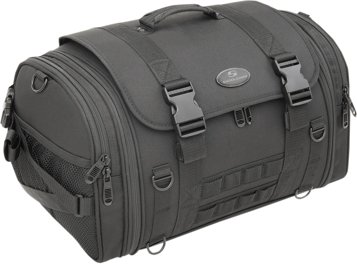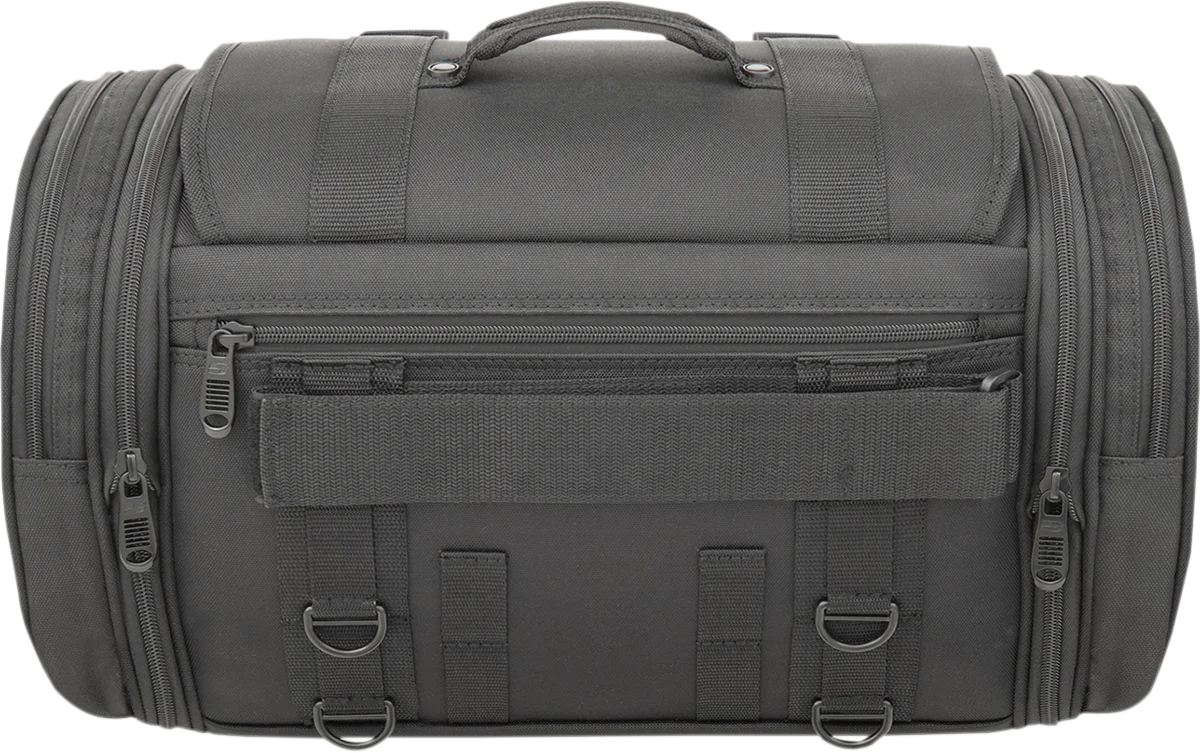 Dimensions: 18" wide x 11" deep x 10.5" tall (with an additional 3” expansion). UV-rated, weather-resistant 1200d chassis. Maintains shape even when empty. Wide zippered center opening assures ease of loading with large jacket or gear flap. End pockets expand out providing additional packing room when needed. Internal molded organizer and zippered mesh pockets keep items organized. Easy-mounted to sissy bar plus full mounting strap kit for a variety of mounting options. All strap end include our unique keepers system which eliminates the need for cutting after the bag is installed. Multiple heavy-duty D-Rings for additional mounting or attaching options. Integrated MOLLE modular attachment points for storage customization. Includes removable shoulder strap and carrying handle for transportation ease. Includes tethered rain cover for added protection from the elements.