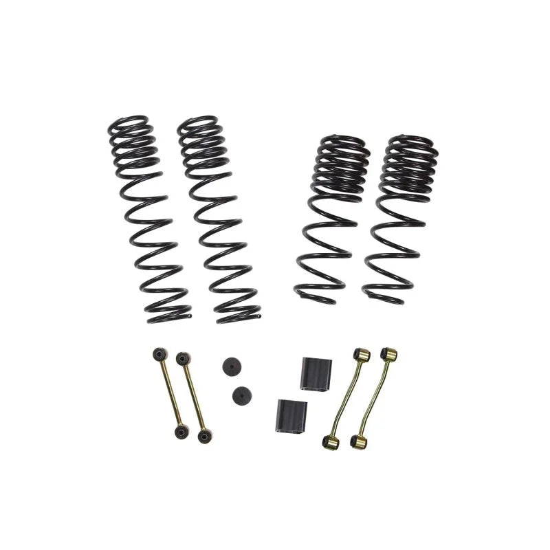 Skyjacker specifically engineered a progressive variable rate coil spring, distinctively a 2-stage dual rate long travel coil. Spring rate progression is from a 1st Flex Rate to a 2nd Ride Rate. The 1st Flex Rate stage delivers a comfortable ride with the ability to flex for increased articulation. The flex rate expands during full articulation as the suspension drops (full droop). This keeps the coil springs seated in the upper coil mount/bucket and the tires in contact with the terrain. The 2nd Ride Rate stage only engages after compression past the flex rate. Engineered to coordinate with the Wrangler's distinctive suspension handling characteristics, the rear coils are side specific. Front and Rear Bump Stop Spacers bolt onto the axle bump pads and keep the suspension travel safely in check. Front and Rear Extended Length Sway Bar End Links allow full articulation as the suspension drops (full droop). These sway bar end links include Skyjacker installed pressed-in HD OEM style rubber bushings. Proper suspension geometry ensures the Electronic Stability Control (ESC) system functions within factory parameters.