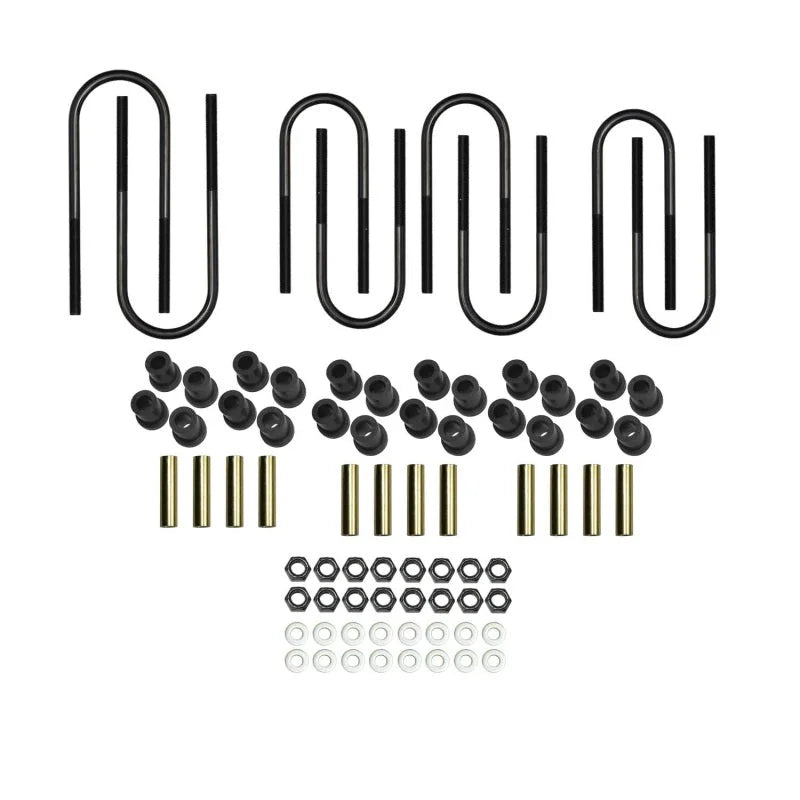 High-quality polyurethane bushings / sleeves deliver a quiet, consistent, controlled, stable, and smooth riding experience. High-quality u-bolts are black e-coated to provide an extremely durable protective barrier to prevent corrosion. Complete with high-quality grade mounting hardware.