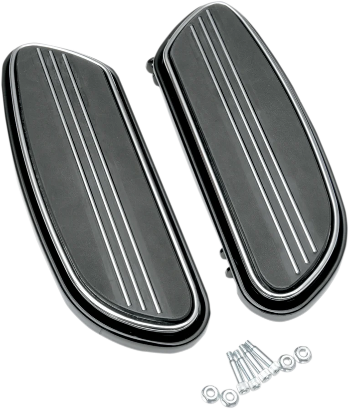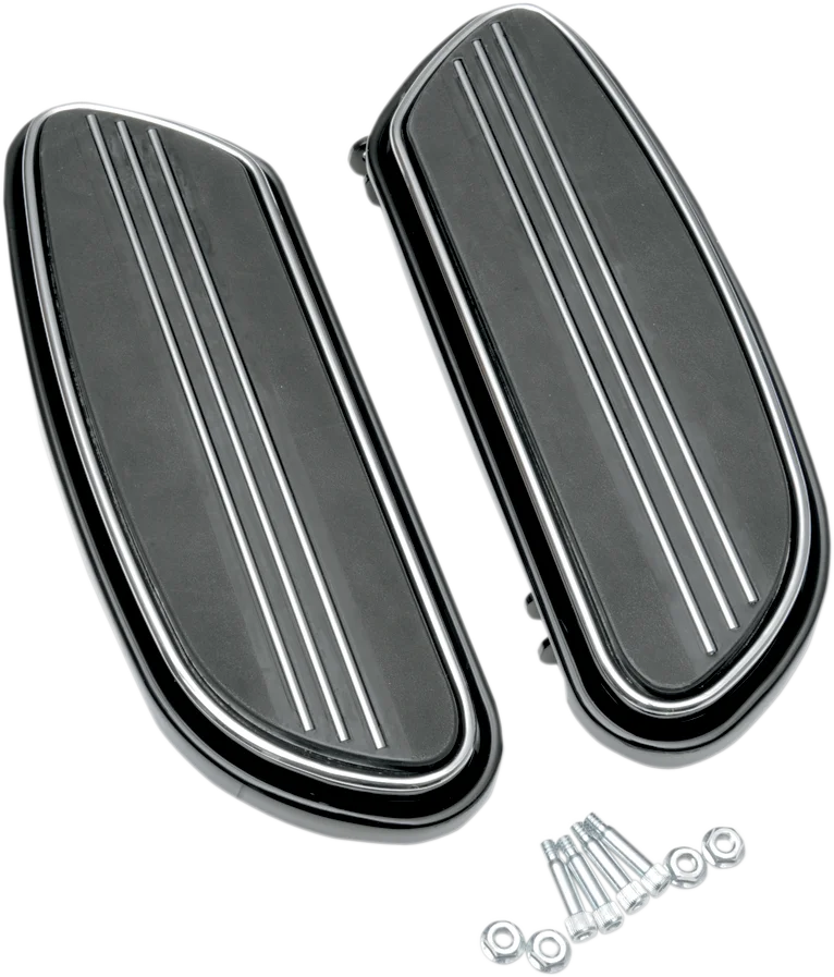 Stamped steel construction. Driver floorboards have built-in vibration isolating dampeners. Floorboard inserts are rubber-coated with chrome trim. Driver floorboards come with mounting hardware. Matching passenger floorboards and brake pedal pad are available separately. Models with passenger footpegs will require separate purchase of accessory floorboard mounts for models with passenger footpegs.
