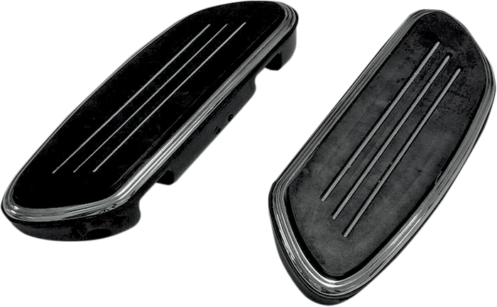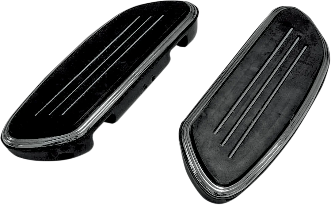 Stamped steel construction. Driver floorboards have built-in vibration isolating dampeners. Floorboard inserts are rubber-coated with chrome trim. Driver floorboards come with mounting hardware. Matching passenger floorboards and brake pedal pad are available separately. Models with passenger footpegs will require separate purchase of accessory floorboard mounts for models with passenger footpegs.