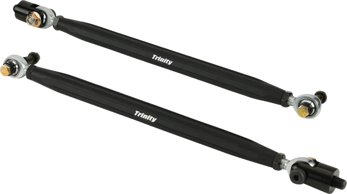Stock tie-rods have the tendency to bend under extreme driving. Trinity Racing tie-rods alleviate that issue and are torture tested in the desert, sand dunes and rock crawling. Tie-rods manufactured from extruded aluminum. High-quality heims are used and all proper misalignments are included to make the install simple. Heims are high quality stainless steel with dust sleeve built into heim. Available in anodized black with laser etched Trinity Racing Logo.