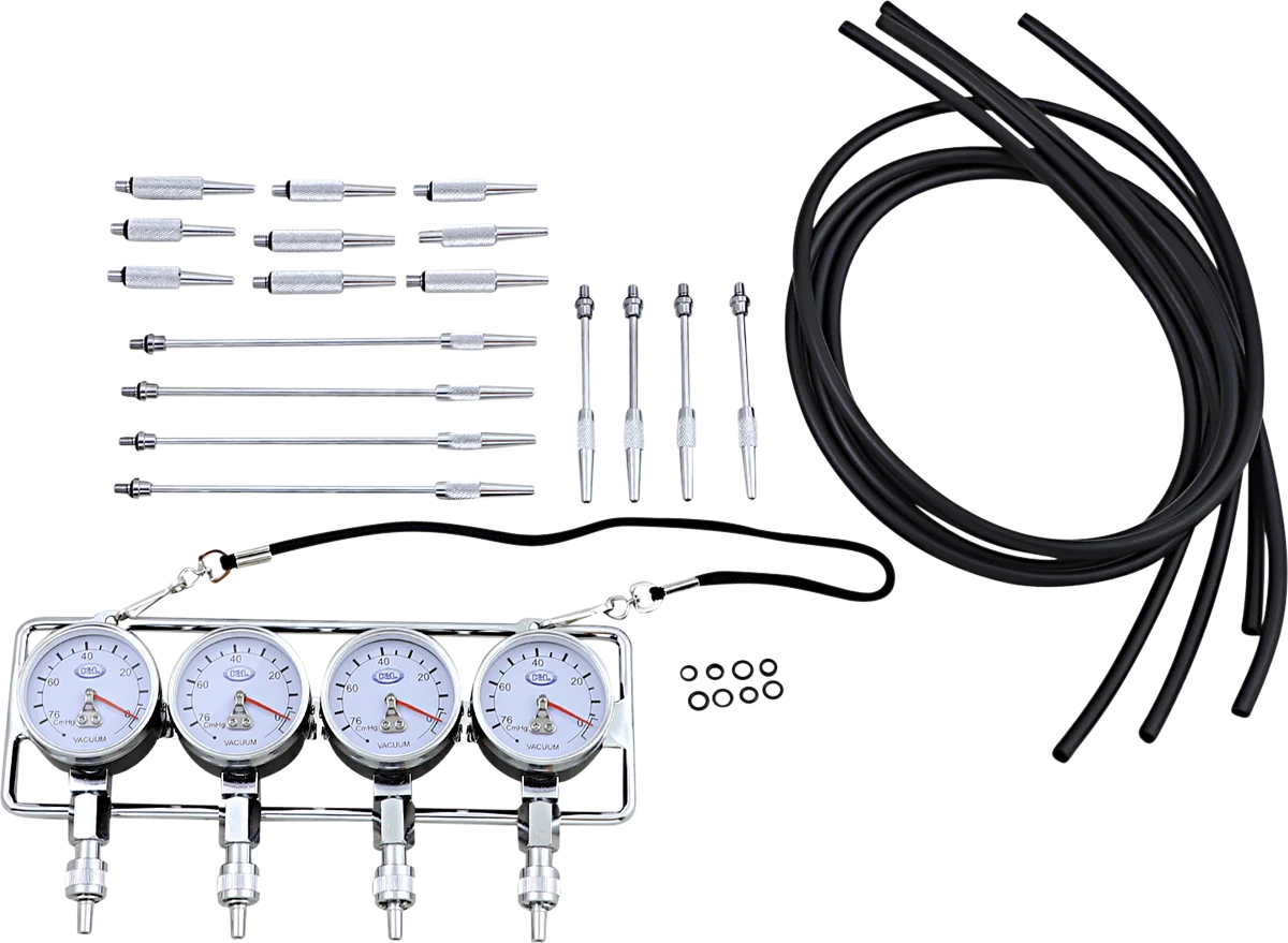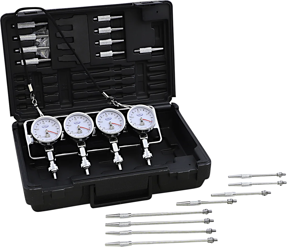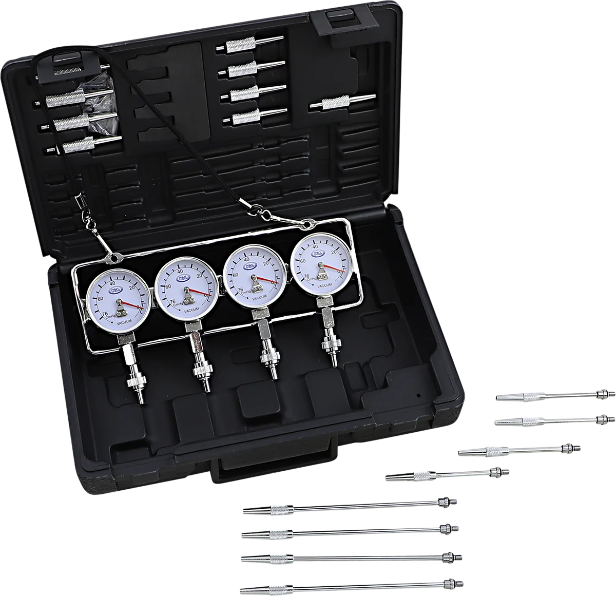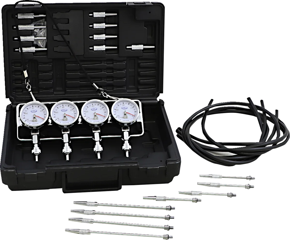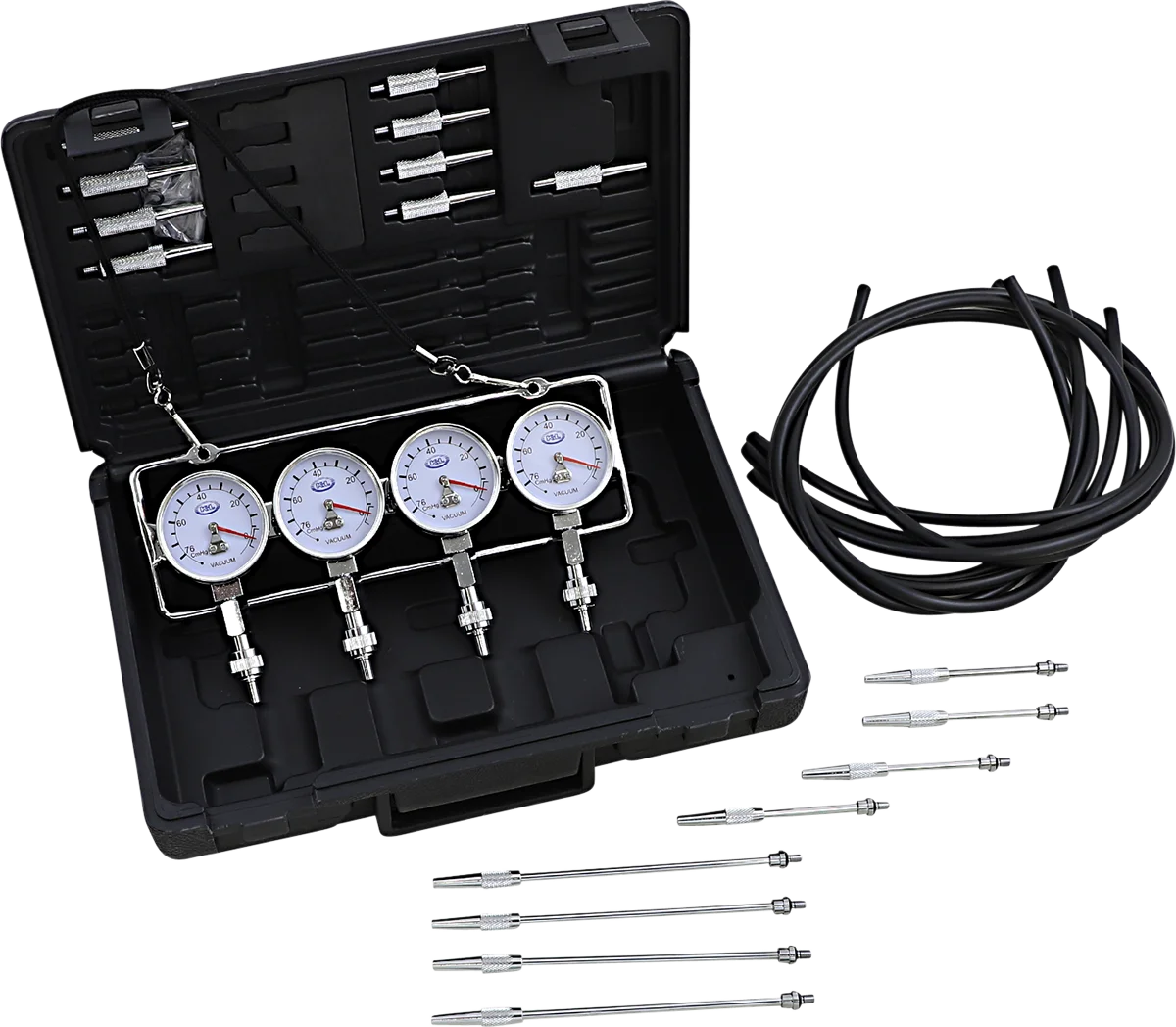 Includes storage case, rubber hoses plus 5 mm and 6 mm adapters with extensions. Built-in restrictions eliminate needle bounce. 2" gauges featured 0-76 cm/hg readings.