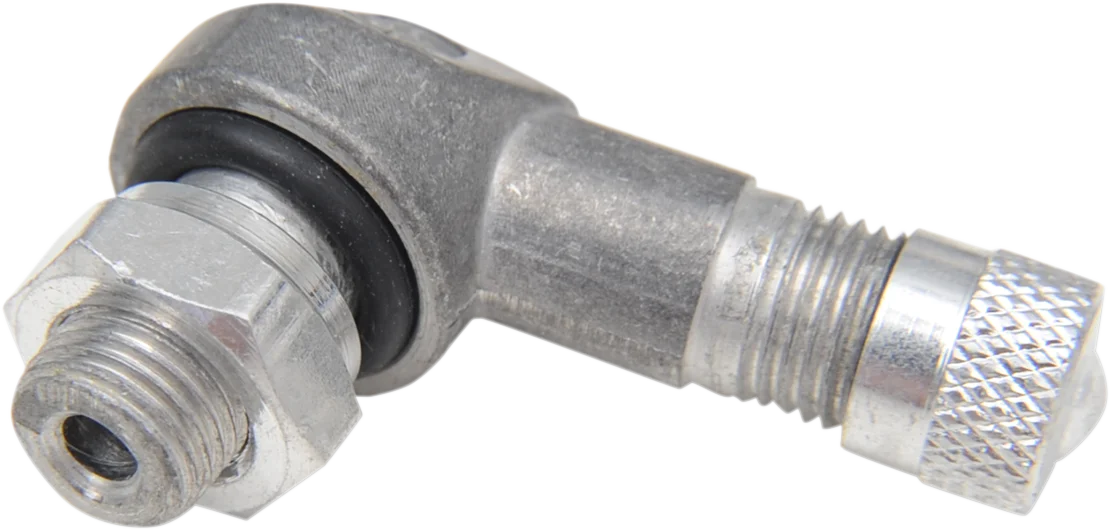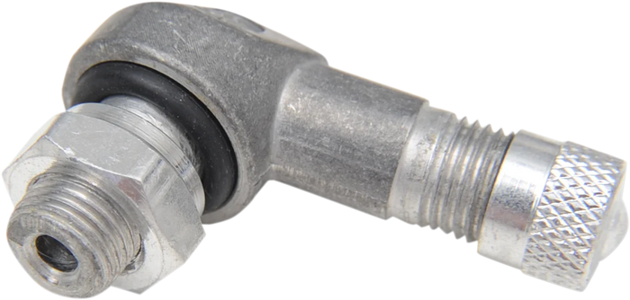 Angled valve stem is a direct 90° bend from the surface of the wheel rim. Right-angle valve stem makes inflating tires on dual disc wheels easy. Ends the hassle of wrestling the air chuck between the brake discs. Made of lightweight aluminum for less weight. For use on most tubeless tire rims.