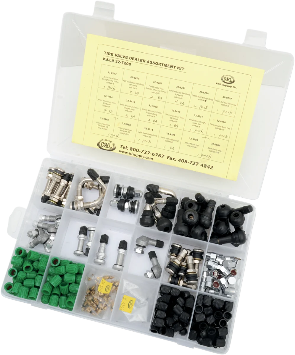 Includes metal, rubber and aluminum tire valve stems along with most popular styles of caps and cores. Replacement parts sold separately. Valve stem kit includes:. JS430 metal long stem, straight. PVR59A metal stem, 90° bend. PVR70M rubber stem, 90° bend. TR412 rubber stem, straight. TR413 rubber stem. 8 mm aluminum stem, 90° bend. 8 mm aluminum long stem, straight. Metal long stem, straight with acorn cap. 10 mm aluminum long stem, straight. 10 mm aluminum stem, 90° bend. 14 mm TV430 metal short stem, straight. 16 mm TV430 metal short stem, straight. Chrome valve stem caps. Green plastic caps (for nitrogen fill). Black replacement caps. #9000 short valve stem cores. 4-in-1 valve stem repair tool.