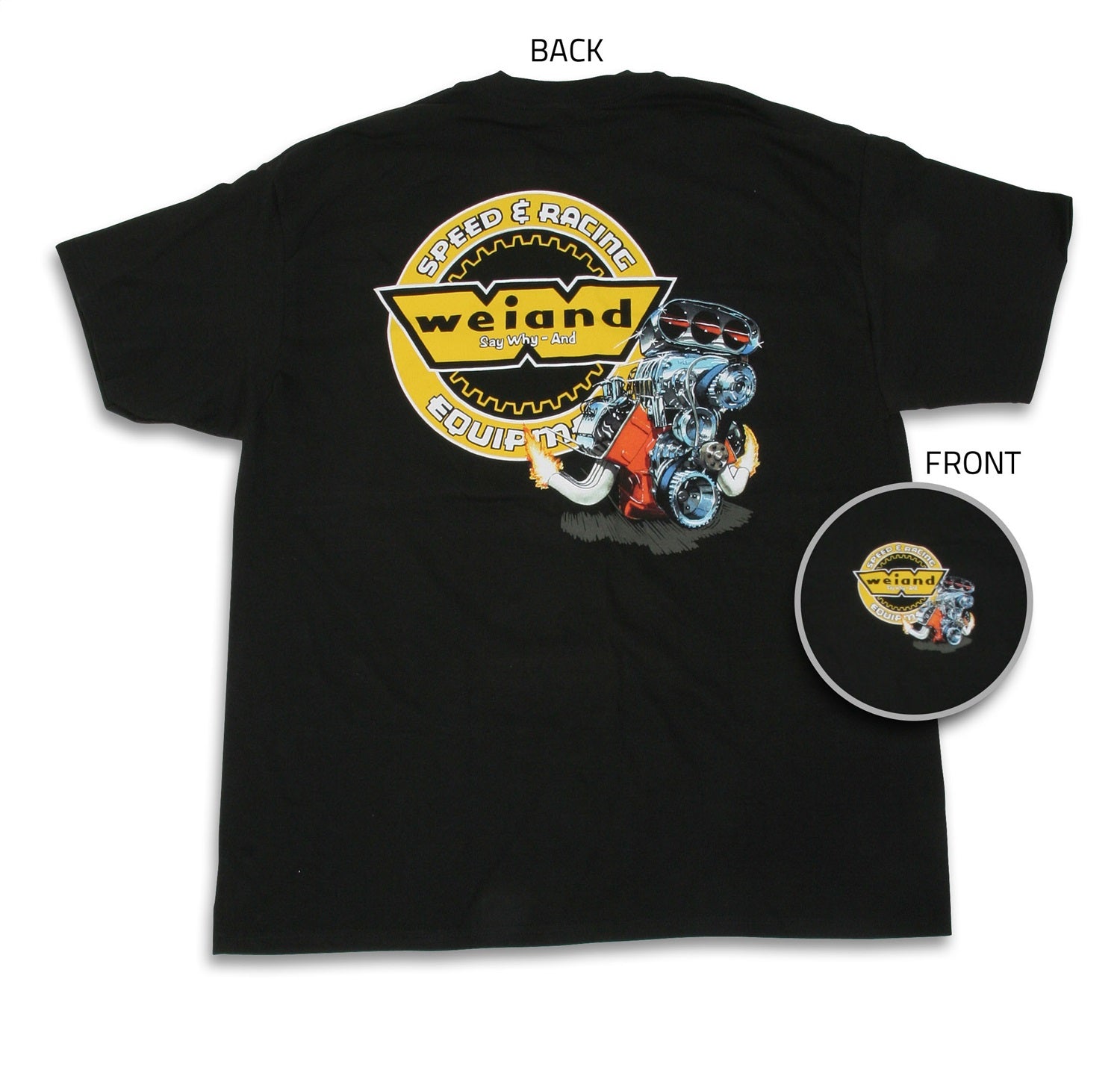 Description_MKT | Black 100% cotton pre-shrunk comfy tee - The new Weiand retro engine t-shirt features the popular blown Hemi engine from the original Weiand retro t-shirt-only this time it's full size on the back! And, what hot rodder doesn't love a big Weiand blower and nostalgic Weiand logos that bring back the flavor of early hot rodding! This t-shirt will tell everyone that sees it that you like power! It's printed on a black comfy tee for hot rodders destined to get greasy! |