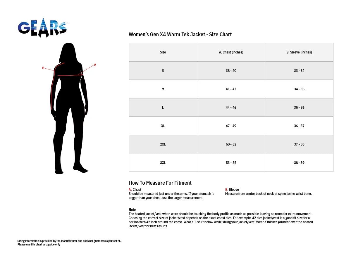 Windproof, waterproof polyester main body construction for maximum warmth. Side panel features dual-layer construction; Lycra® (inner) and breathable cotton/Lycra® blend (outer) allows moisture to escape while retaining heat and a snug fit. Entire liner is heated, including the back and collar. Men's jackets feature an external zippered pocket on the front chest; women's jacket features two front side pockets and a female-specific tapered fit. Connects to 12V power source; 20" battery cord included. Provides 87W of heat and draw 6.4A. Glove connector cables at the end of each sleeve. Two input connection points are fixed on the inside left panel allowing jacket and optional gloves to be controlled separately. On/off and temperature control for the jacket liner requires the purchase of either the coax switch cord (PART #2130-0073) or single output temperature controller (PART #2130-0070); for use with gloves, purchase either the dual coax switch cord (PART #2130-0080) or dual temperature controller (PART #2130-0071), all sold separately.