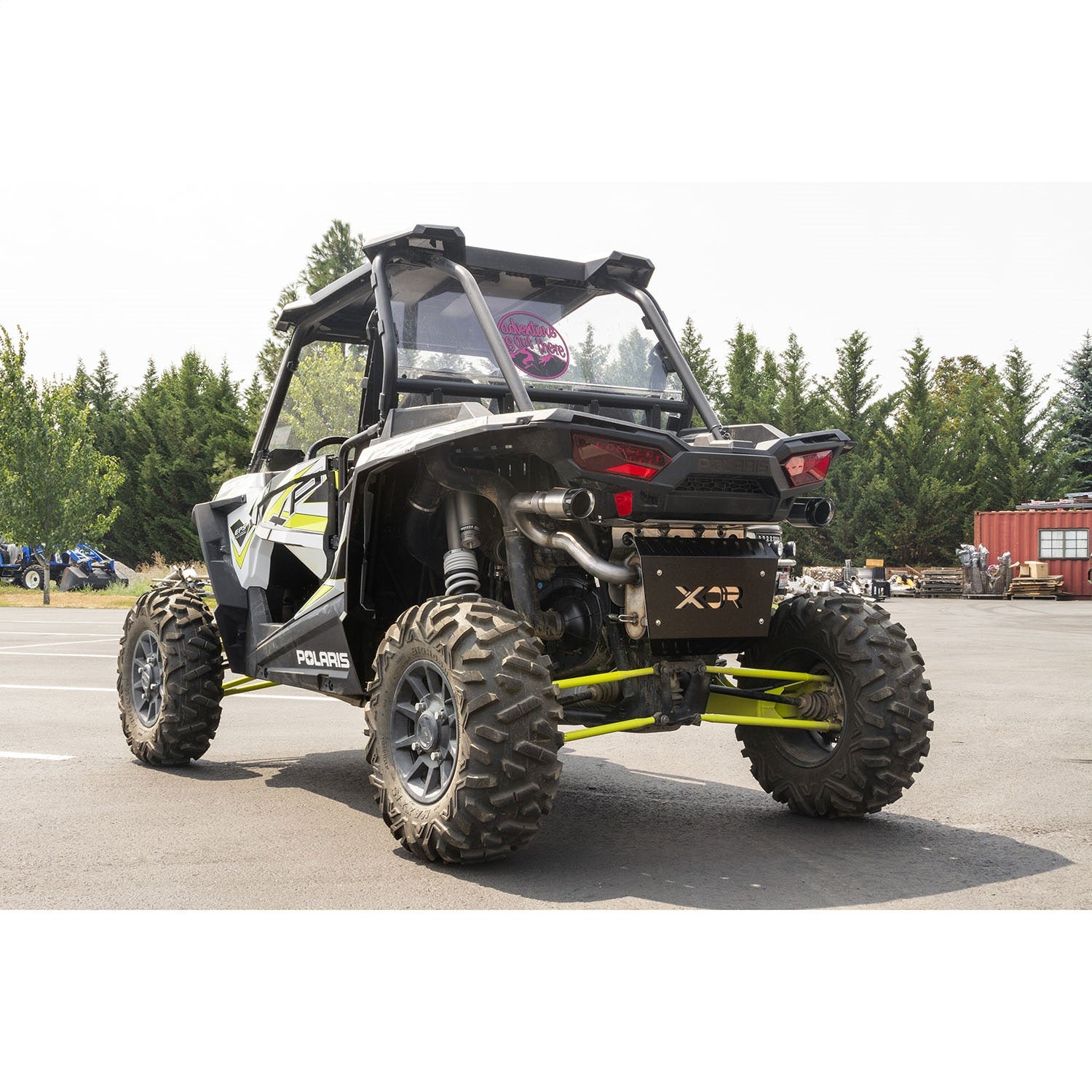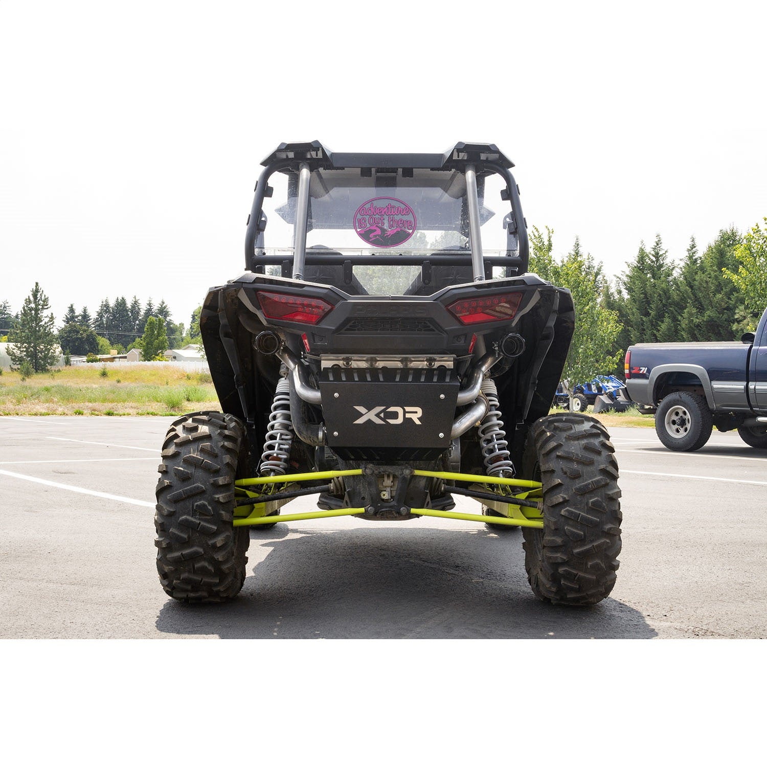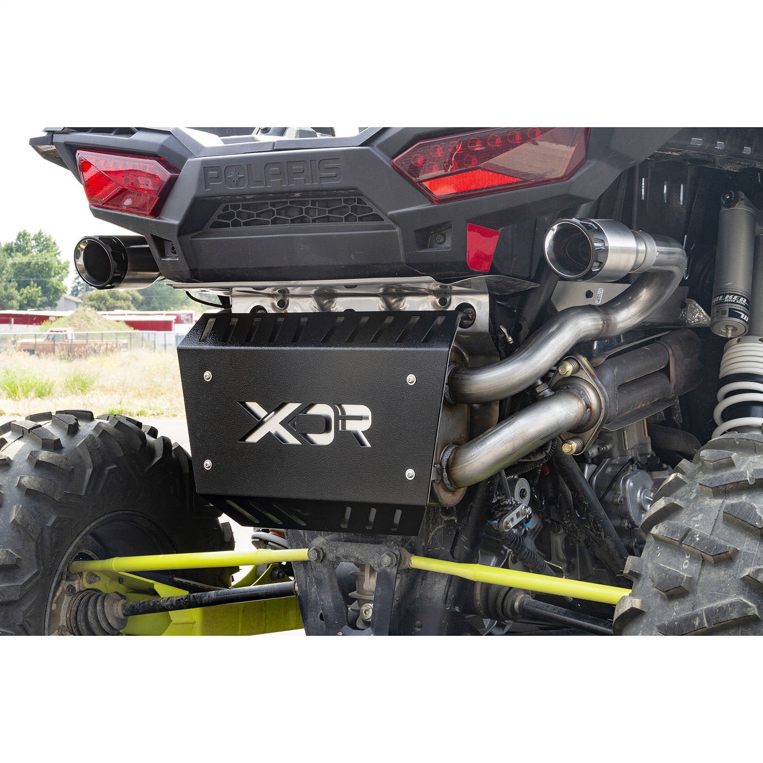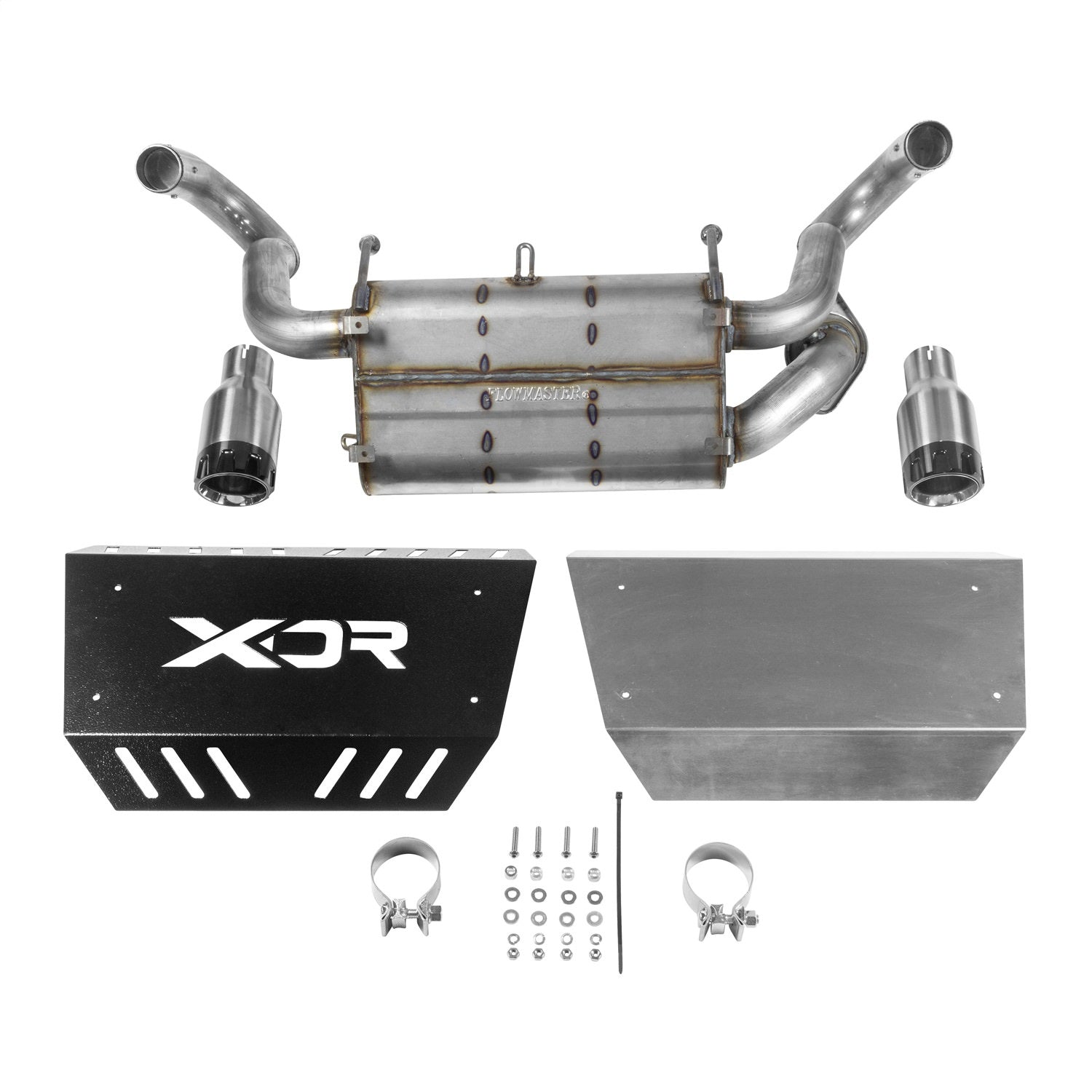 Description_MKT | This new bolt-on XDR Off-Road® Competition exhaust system is for the 2018-2019 Polaris RZR XP 1000 and XP 4 1000. The system connects at the factory flanged connection and is firmly held in place using the factory rubber mounts and springs. Features include 409S stainless steel construction with a 2.50-inch mandrel-bent inlet tube flowing into the XDR Off-Road cross-flow performance muffler with dual 2.25-inch mandrel-bent tailpipes tucked up high within the rear fenders providing a moderate to aggressive deep sound level. The tailpipes are finished off with a pair of 3.50-inch dual wall brushed 304s stainless steel tips with black anodized aluminum ends. The factory exhaust cut-out is replaced with a custom black powder coated heat shield with the XDR logo laser cut in the shield showing everyone behind you, why your RZR sounds so good. Includes all hardware and installation instructions necessary for a simple at home installation. For off-highway competition use only. |
