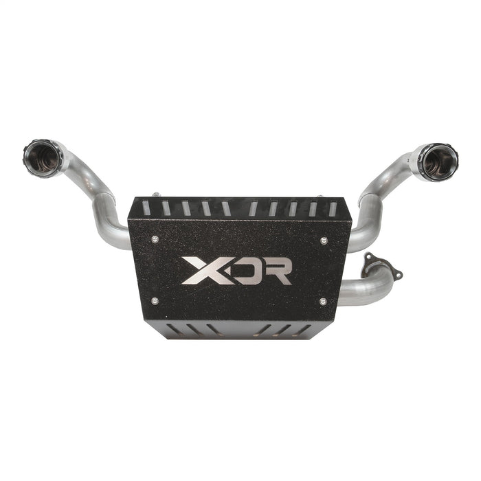 Description_MKT | This new bolt-on XDR Off-Road® Competition exhaust system is for the 2016-2018 Polaris RZR XP Turbo and XP 4 Turbo. Does not include the Turbo S models. The system connects at the factory flanged connection and is firmly held in place using the factory rubber mounts and springs. Features include 409S stainless steel construction, a 2.25-inch mandrel-bent inlet tube flowing into the XDR Off-Road "straight-through" cross-flow Competition muffler providing a deep moderate sound level. The dual 2.25-inch mandrel-bent tailpipes are tucked up high within the rear fenders and are finished off with a pair of 3.50-inch brushed 304s stainless steel tips with black anodized aluminum end caps. The system comes with a custom black powder coated heat shield sporting a laser-cut XDR logo in the shield showing everyone behind you why you're RZR sounds so good. Includes all necessary hardware and detailed instructions for a simple at home installation. Note: This system does not include a catalytic converter and therefore is not emissions compliant for on-road or trail use. For Competition use only. |
