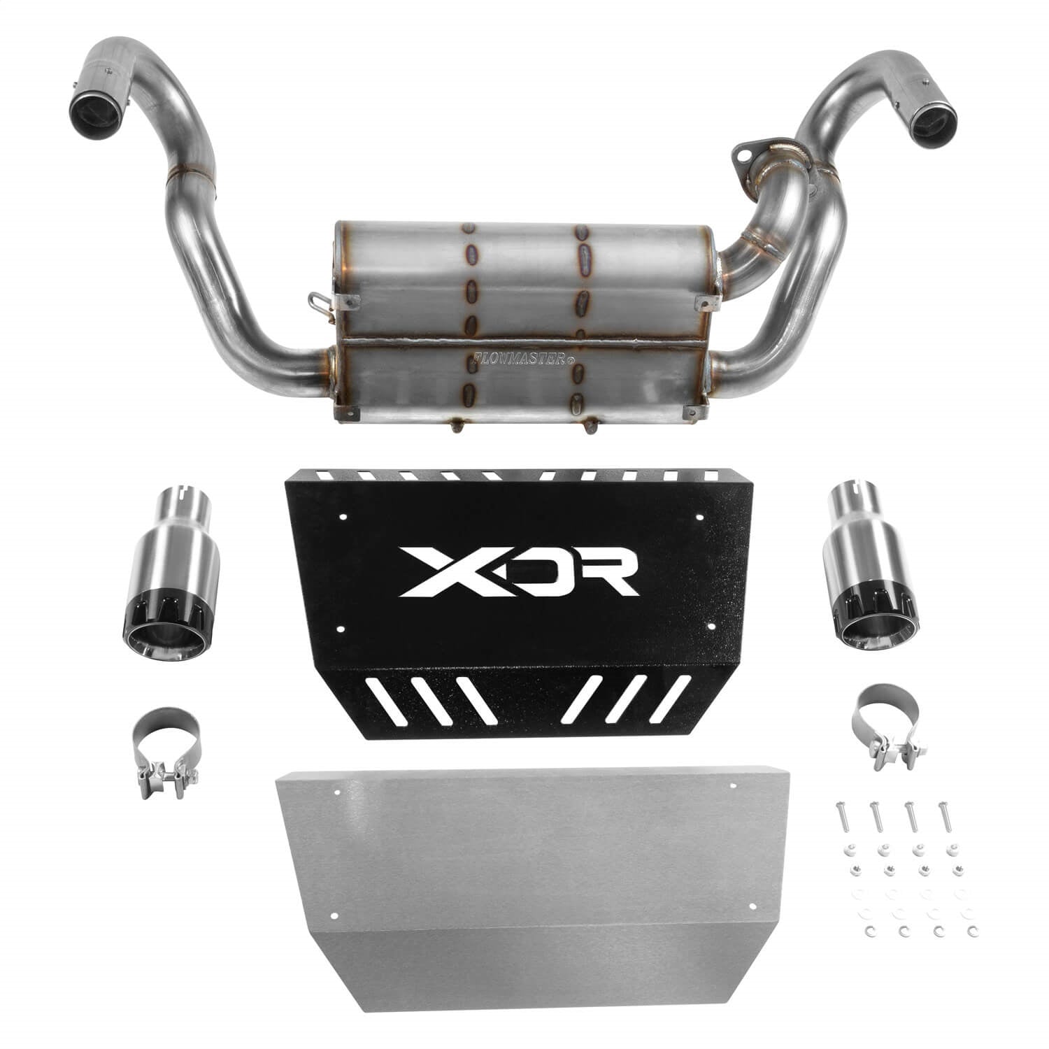 Description_MKT | This new bolt-on XDR Competition exhaust system is for the 2016-2018 Polaris RZR S 1000 engine. Does not include the Turbo S models. The system connects at the factory flanged connection and is firmly held in place using the factory rubber mounts and springs. Features include 409S stainless steel construction, a 2.50-inch mandrel-bent inlet tube flowing into the XDR "straight-through" cross-flow Competition muffler providing a deep moderate to aggressive sound level. The dual 2.25-inch mandrel-bent tailpipes are tucked up high within the rear fenders and are finished off with a pair of 3.50-inch brushed 304s stainless steel tips with black anodized aluminum end caps. The system comes with a custom black powder coated heat shield sporting a laser-cut XDR logo in the shield showing everyone behind you why you're RZR sounds so good. Includes all necessary hardware and detailed instructions for a simple at home installation. Note: This system does not include a catalytic converter and therefore is not emissions compliant for on-road or trail use. For Competition use only. |