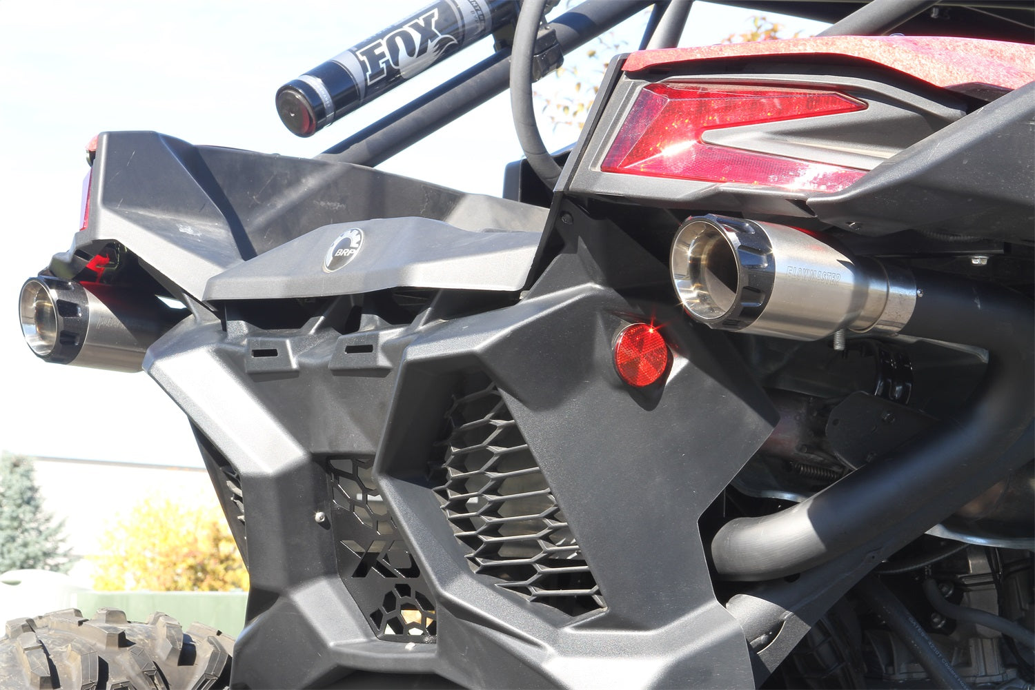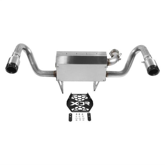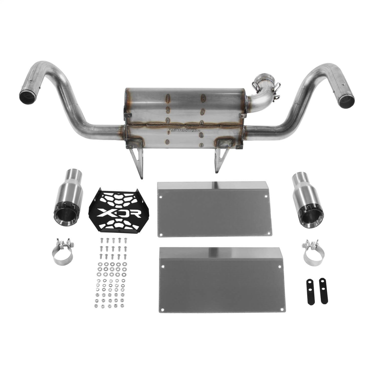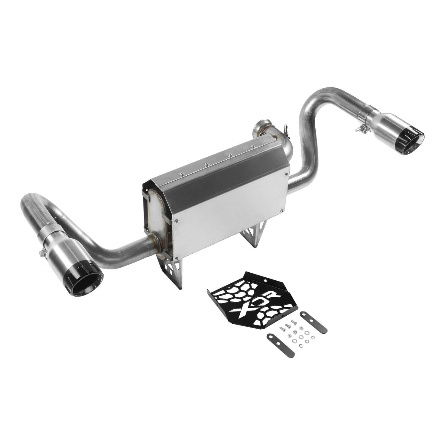 Description_MKT | This new bolt-on Competition exhaust system fits all 2017-2021 Can-Am Maverick X3 Turbo/Turbo R models and features 409S stainless steel construction with a 2.50-inch mandrel-bent inlet tube flowing into an XDR "straight-through" cross-flow competition muffler. The system has a deep moderately aggressive sound level and the dual 2.25-inch mandrel-bent tailpipes are tucked up high within the rear fenders, include USFS qualified spark arrestors and are finished off with a pair of 3.50-inch brushed 304s stainless steel tips with black anodized aluminum end caps. The factory exhaust cut-out is replaced with a custom black powder coated heat shield with a laser-cut XDR logo showing everyone behind you why your X3 sounds so good. Includes all hardware and installation instructions necessary for a simple at home installation. This bolt-on system does not affect emissions and can be used for on-road or trail use. |